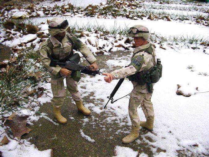 | Two 3rd Infantry Division MP's doing a train up for the Desert at snowy Ft. Stewart GA. They have snuck up on an OPFOR soldier. |