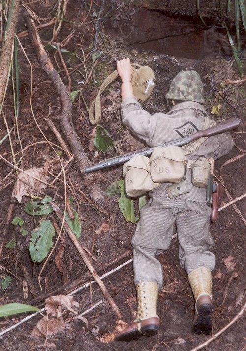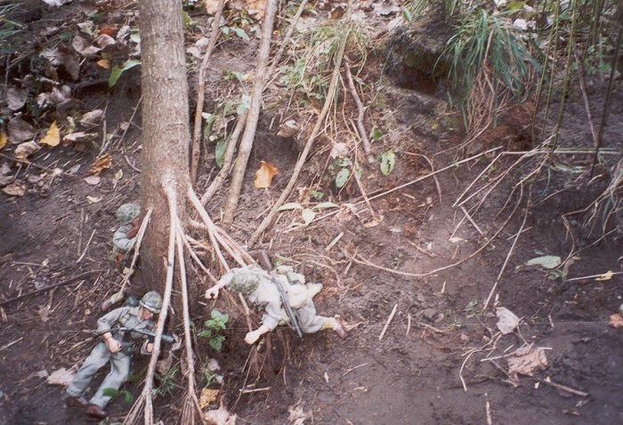 The squad leader lays on fire as the demo man makes a hasty exit.