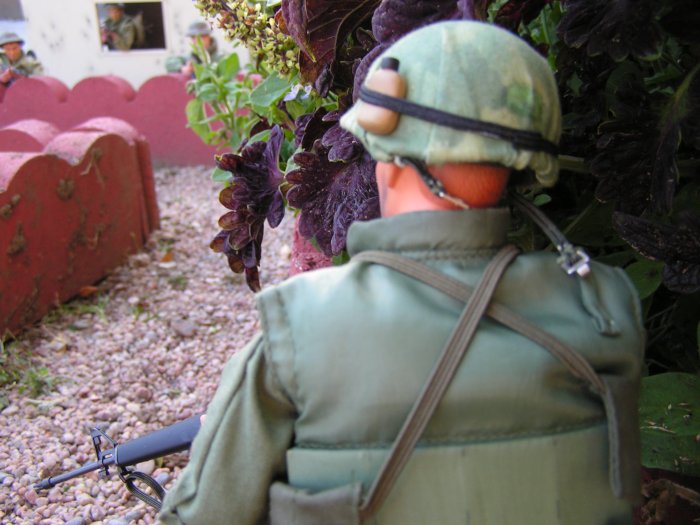 | Campbell peers around the garden wall, still nothing, no sounds..... he slowly moves ahead... |