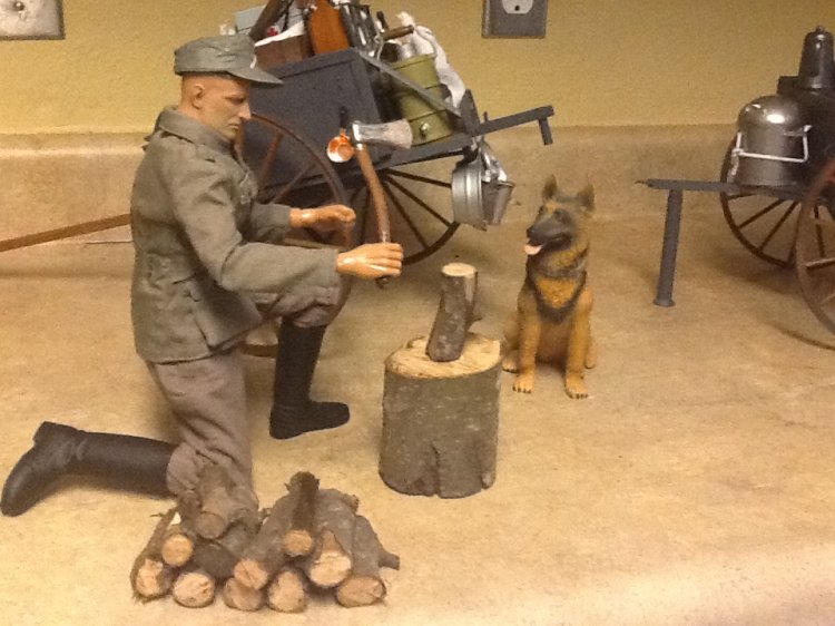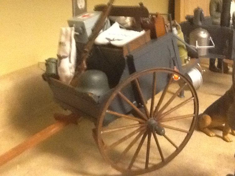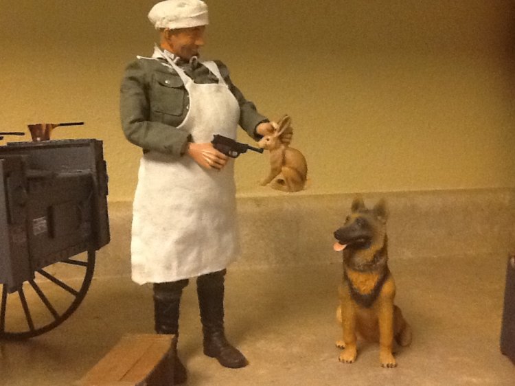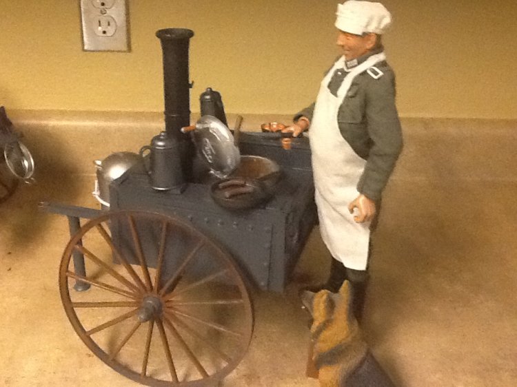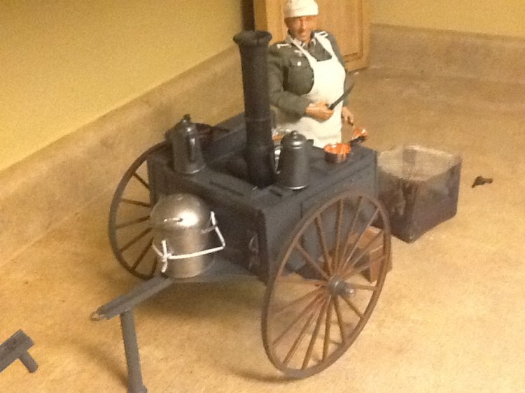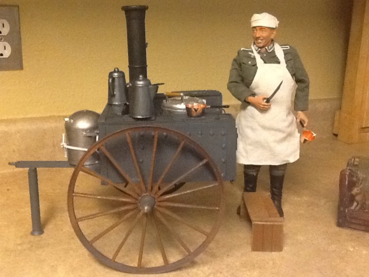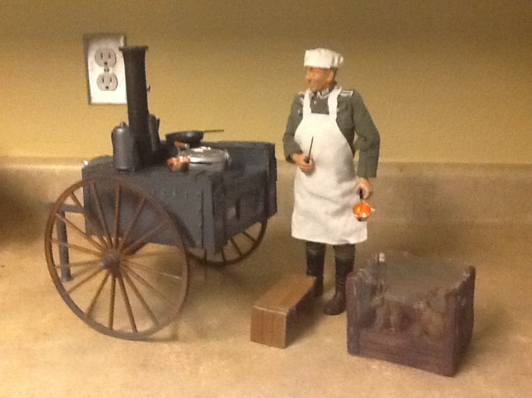 From the " I know a good idea when I steal one" file, I wanted to do a German field kitchen when our good friend Sgt Howard said that he was starting one also. Taking the easy route on this project, I started out with a Johnny West wagon as the base. Going off of photos, I cut up the wagon and got some sheet styrene from the hobby shop. I pretty much had to fight the balance battle all the way, as the Johnny West wagon wheels are tall and skinny, unlike the shorter wheels that the real units used. The soup pot has a hot glue and wood chunk mixture to look the meal of the day. The cook has a couple rabbits to kill for some needed meat and his helper has been chopping wood or the This was a fun project, but I'm sure Sgt Howard's version will be better than mine.