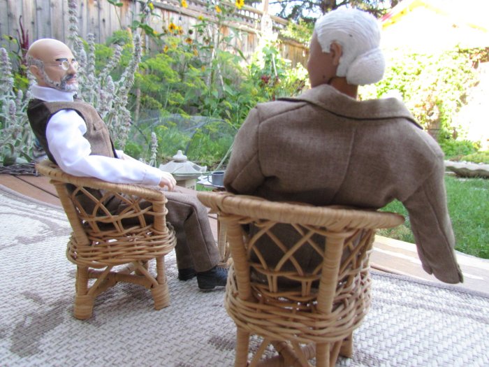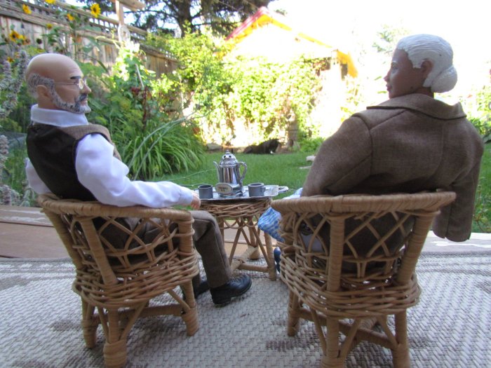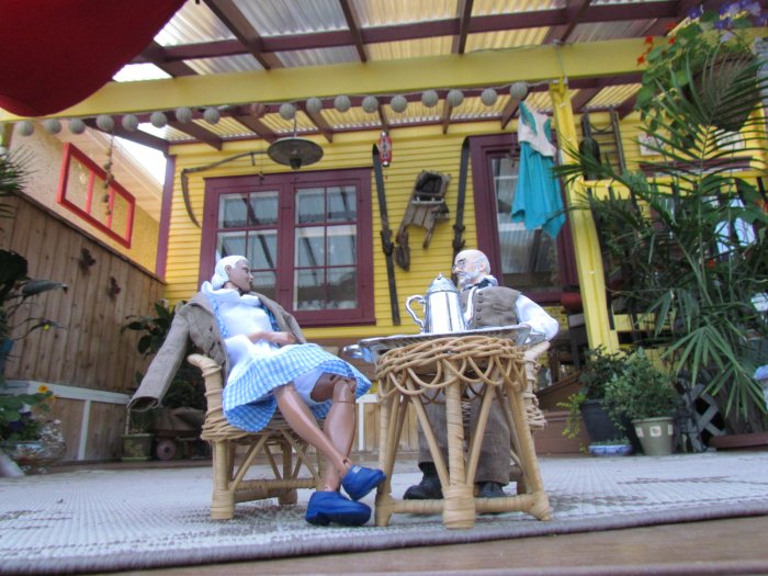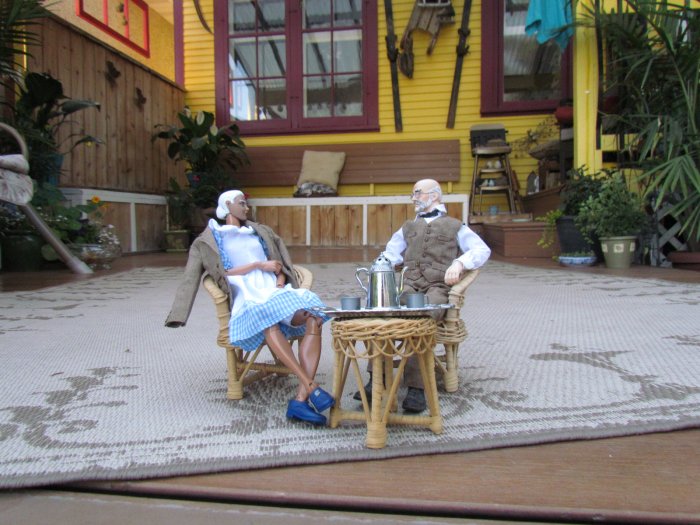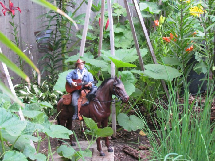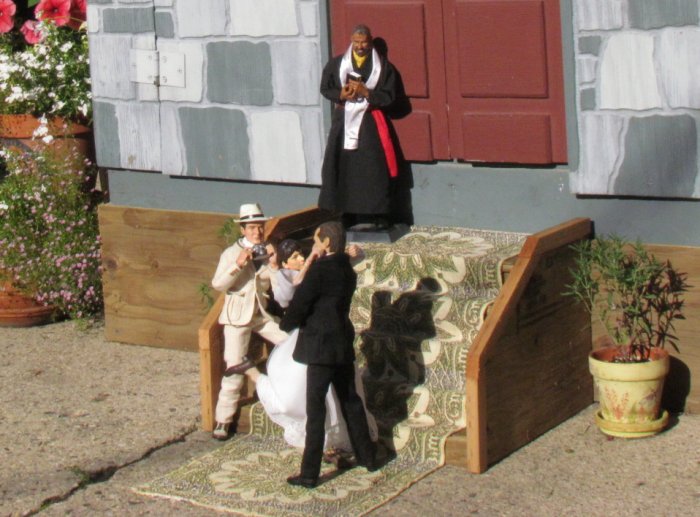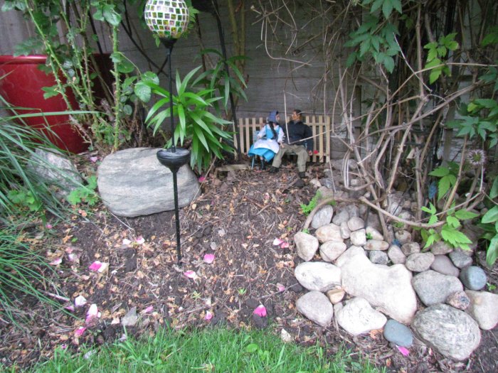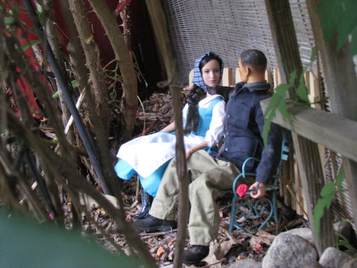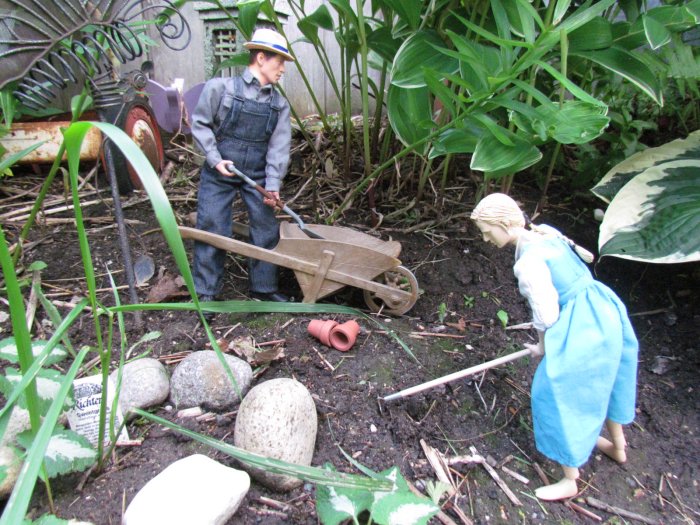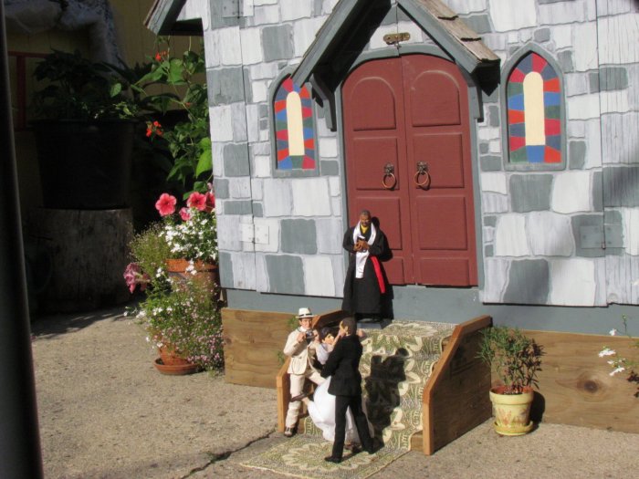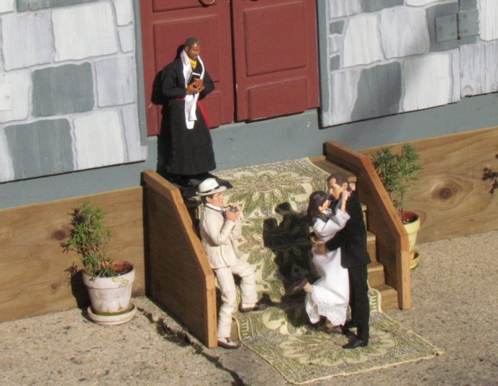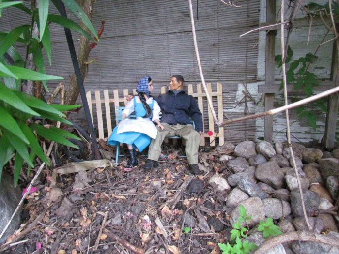 We got the yard looking even better then it already did, then I asked if I could do some dios in the yard. I told her my ideas and came up with these. I made a set of steps for the church and it all came together. The only one that didn't make the cut was the singing cowboy. We both thought it looked cool, it just didn't fit, but I took some shots of him anyway. Oh forgot to say we had over 350 people came through the yard in 3 days. One lady, when she saw the dios, asked if the park bench scene was when I asked her to marry me. Then there are scenes of the wedding and then working in the garden together ever since. However, she asked if there was an ending to the story - so I came up with the ending pics. |