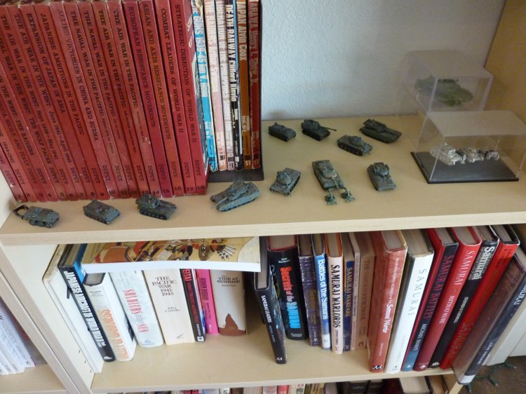 | Cube of Historical World War II items, another cube of mementos from Japan that my family bought, and some of the micro machine JSDGF tanks (1/144, I believe) on my library shelves. |