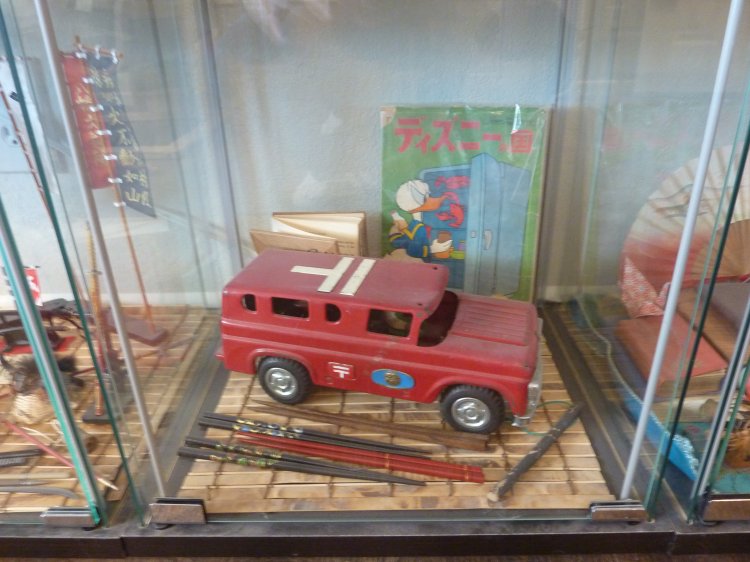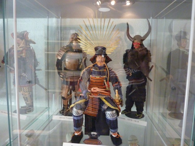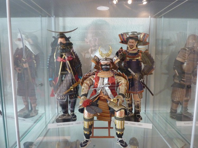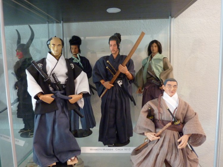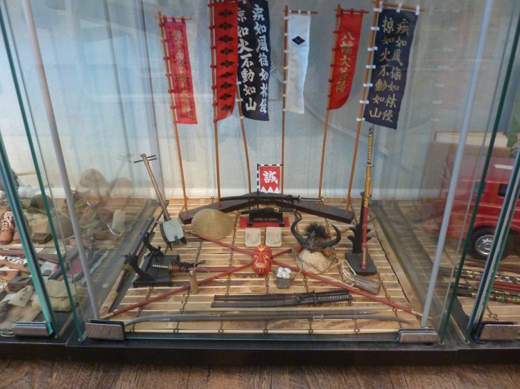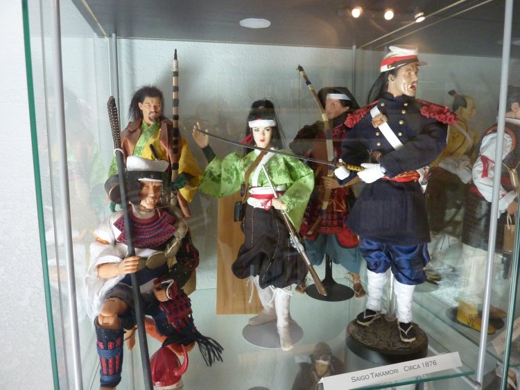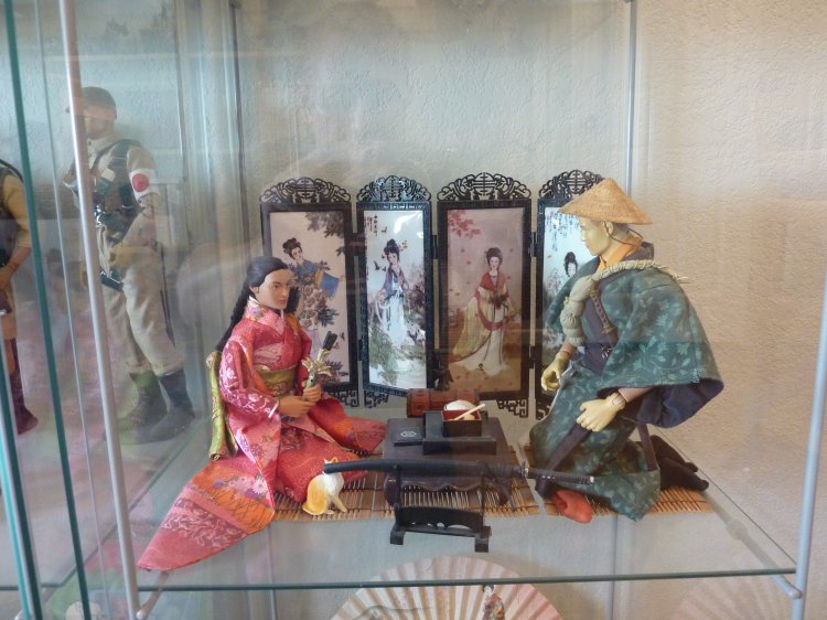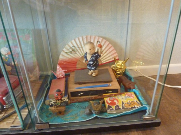 Two cubes of Childhood mementos, one of a small diorama I've always enjoyed (FYI, the kimono that the male samurai wears was made by our own Storm, years ago), and a cube of historic samurai gear.