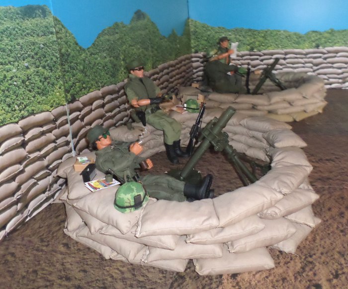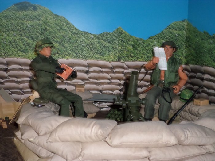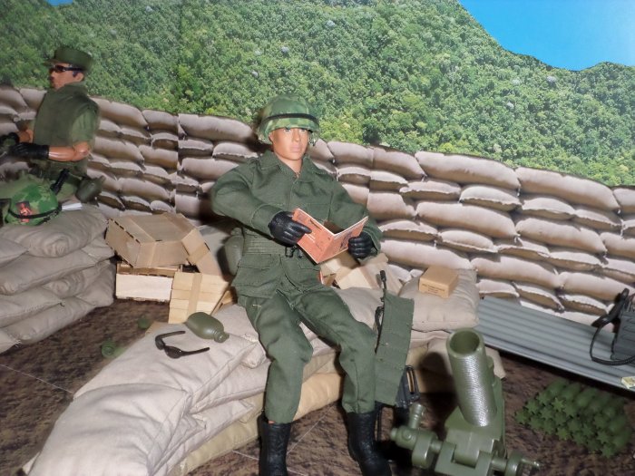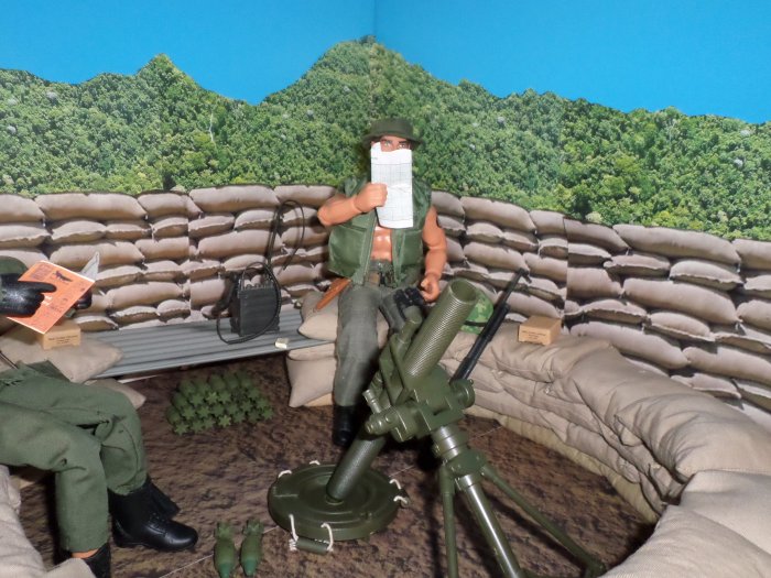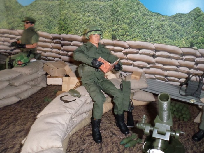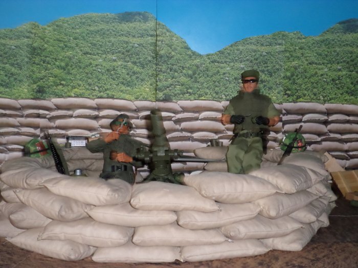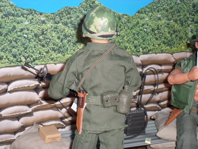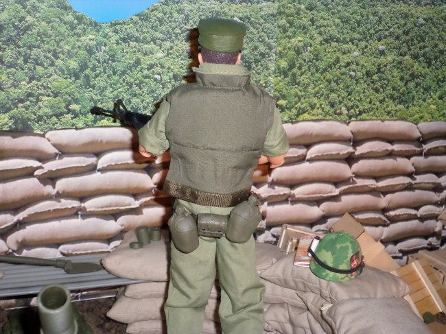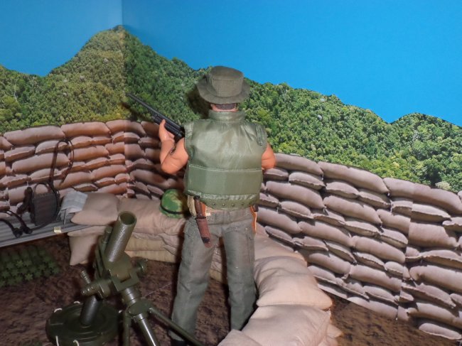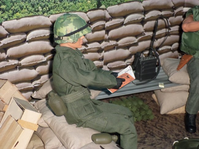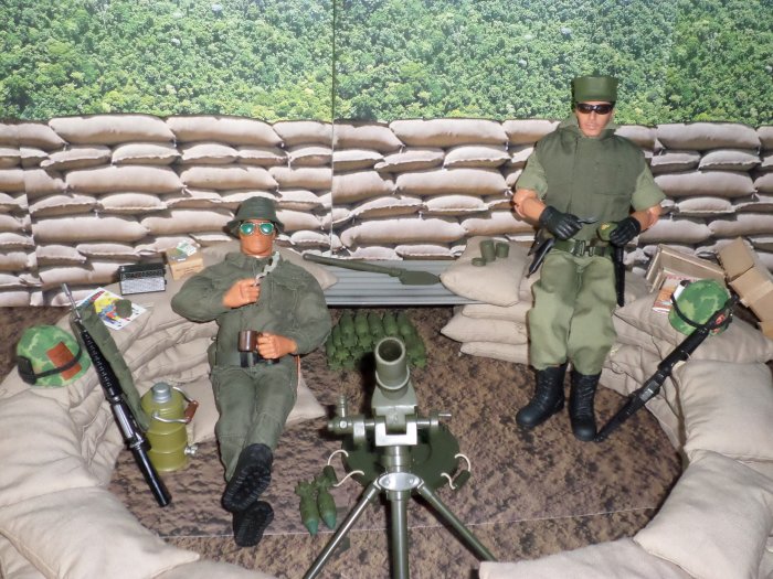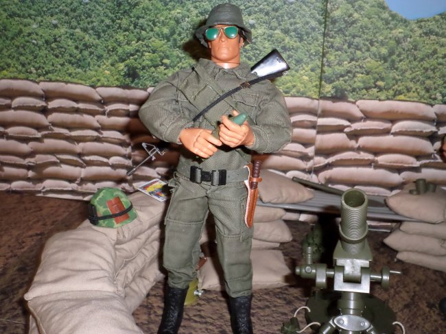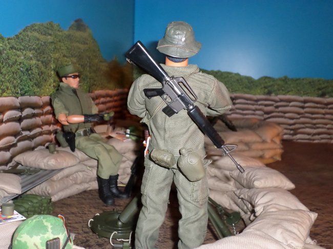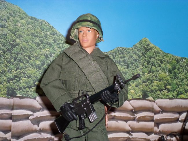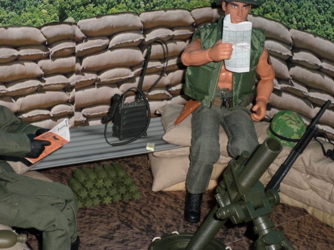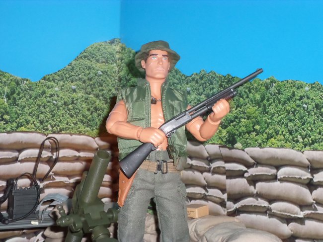 Keith Ramsey, a brown haired, brown eyed, WP figure with mustache and goatee and black gloved hands. / dressed in SOTW O.D. uniform, TUS O.D. flack vest, Hasbro O.D. (custom painted) field cap, WP sunglasses, black boots, Dragon belt, TUS 2nd gen jungle first aid pouch, 2 1st gen canteens, Dragon K-bar knife and sheath, TUS M-1911 pistol in holster, TUS M-16 rifle. Duane Hatfield, a blonde haired, blue eyed, WP figure with black gloved hands. / dressedin TUS O.D. uniform, unknown mfg. helmet with custom cloth Mitchel pattern camo cover, SOTW black boots, TUS belt, jungle first aid pouch, 1st gen canteen, K-bar knife and sheath, ammo bandolier, Cotswold M-16 rifle. Dick Johnson, a black haired, blue eyed, Action Man figure with tattoo. / dressed in unknown mfg . O.D. pants, Dragon O.D. flack vest, WP dog tags, TUS O.D. boonie hat, black boots, belt, compass pouch, M-3 fighting knife and sheath, M-1911 pistol in holster, .45 cal. Ammo pouch, Hasbro shotgun. |