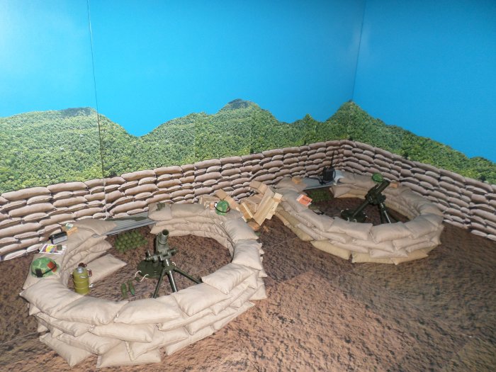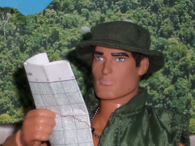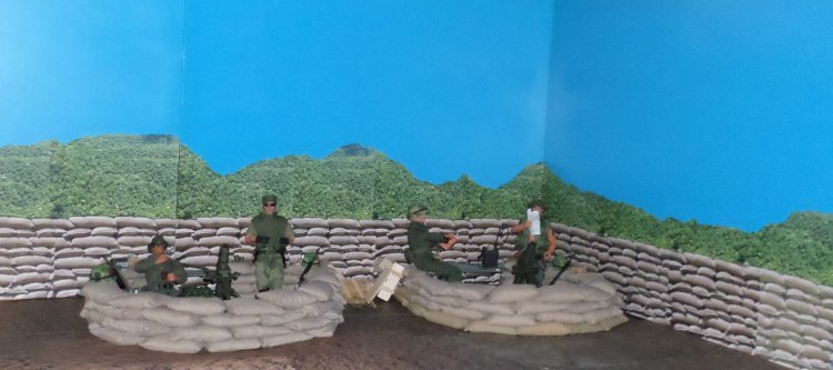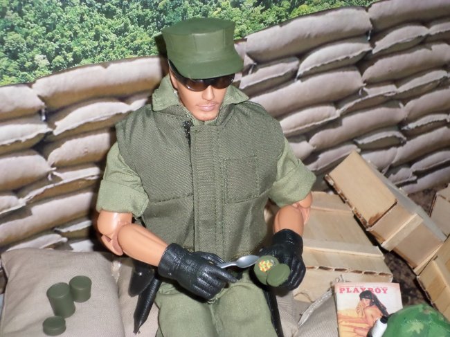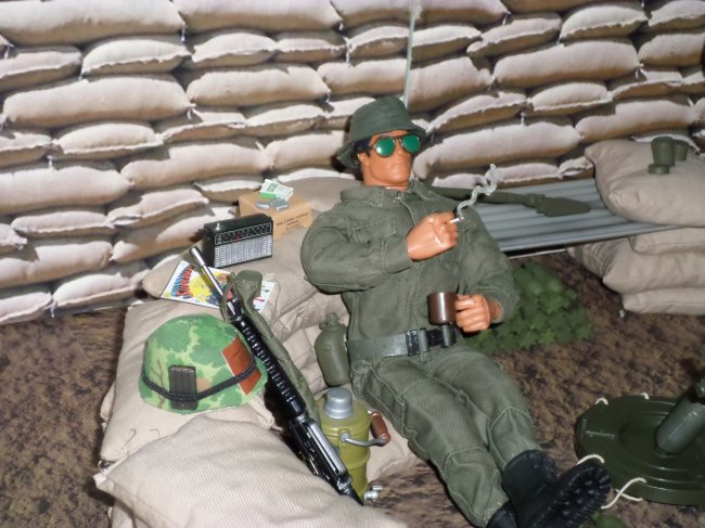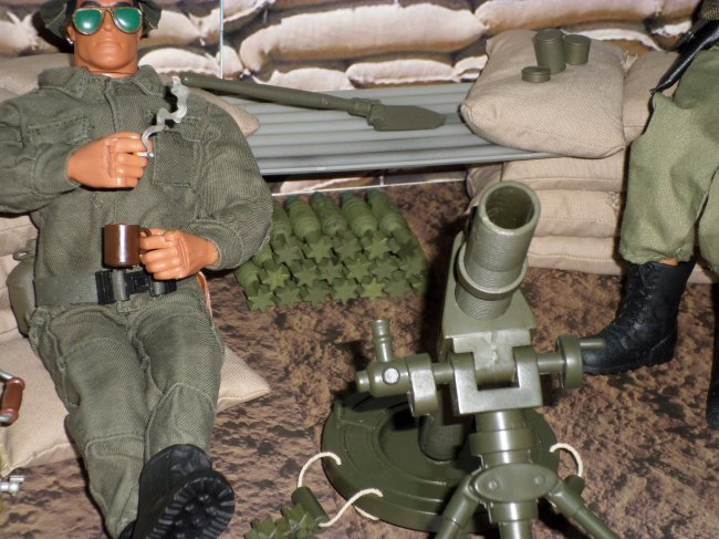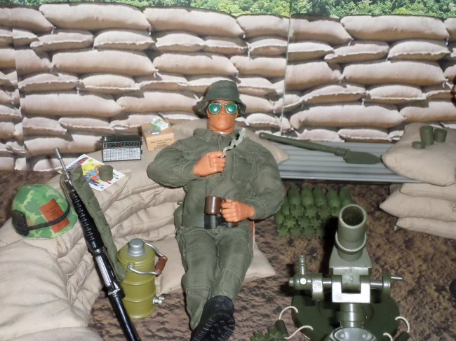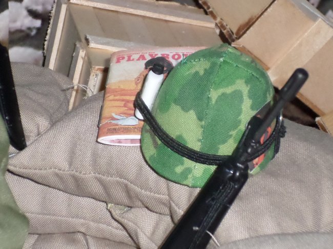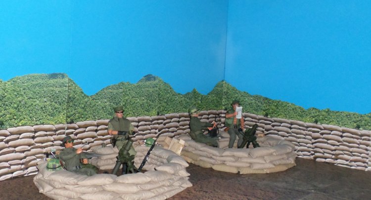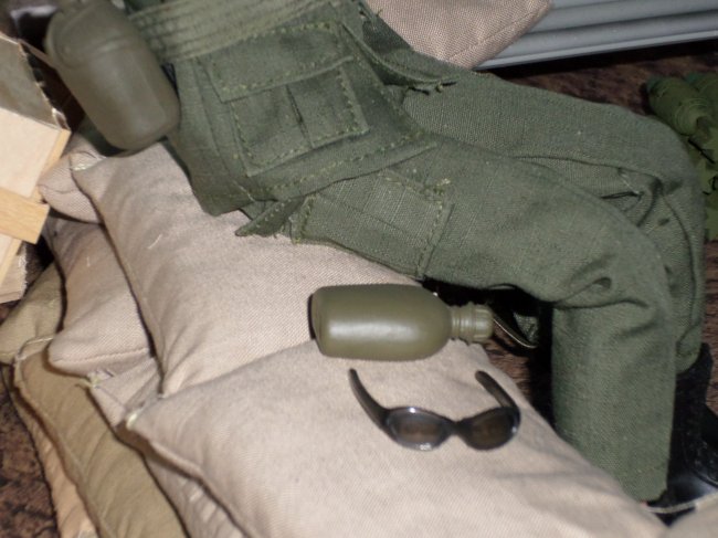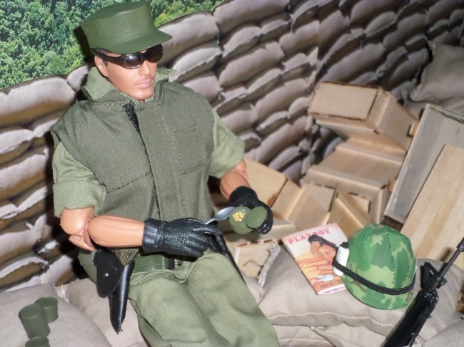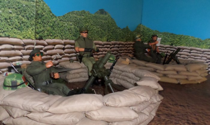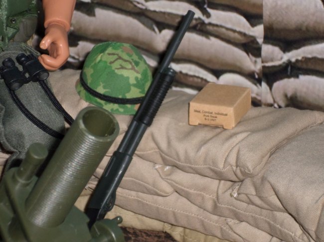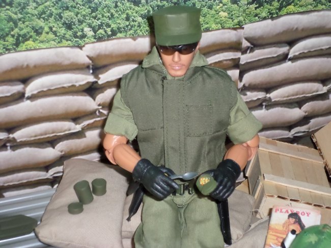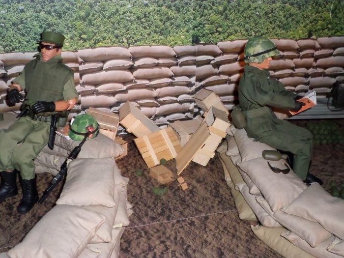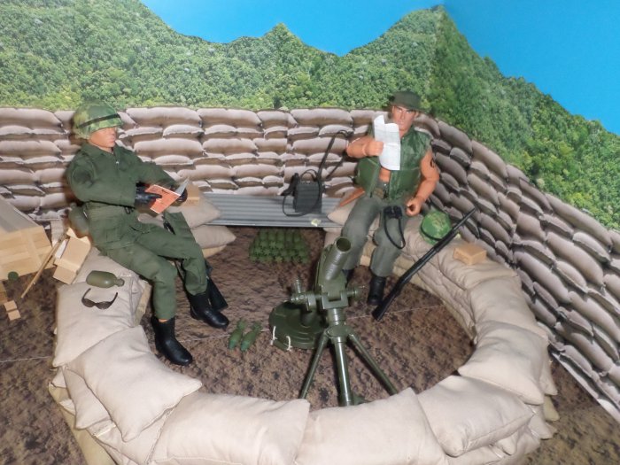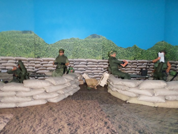 Keith Ramsey, a brown haired, brown eyed, WP figure with mustache and goatee and black gloved hands. / dressed in SOTW O.D. uniform, TUS O.D. flack vest, Hasbro O.D. (custom painted) field cap, WP sunglasses, black boots, Dragon belt, TUS 2nd gen jungle first aid pouch, 2 1st gen canteens, Dragon K-bar knife and sheath, TUS M-1911 pistol in holster, TUS M-16 rifle. Duane Hatfield, a blonde haired, blue eyed, WP figure with black gloved hands. / dressedin TUS O.D. uniform, unknown mfg. helmet with custom cloth Mitchel pattern camo cover, SOTW black boots, TUS belt, jungle first aid pouch, 1st gen canteen, K-bar knife and sheath, ammo bandolier, Cotswold M-16 rifle. Dick Johnson, a black haired, blue eyed, Action Man figure with tattoo. / dressed in unknown mfg . O.D. pants, Dragon O.D. flack vest, WP dog tags, TUS O.D. boonie hat, black boots, belt, compass pouch, M-3 fighting knife and sheath, M-1911 pistol in holster, .45 cal. Ammo pouch, Hasbro shotgun. |