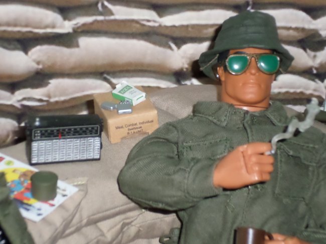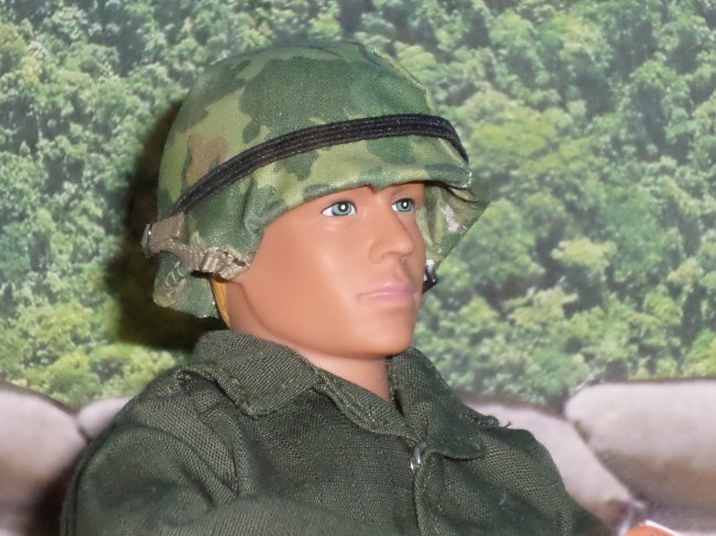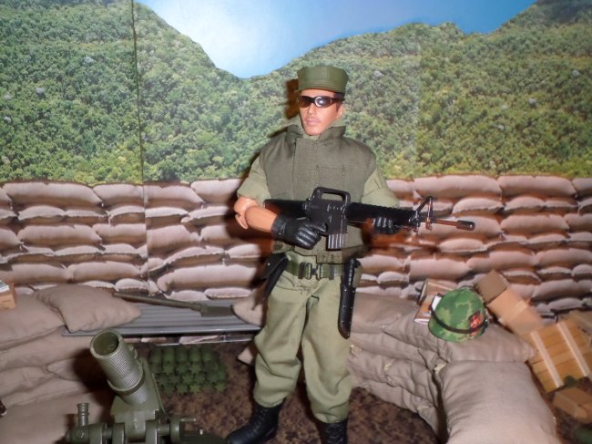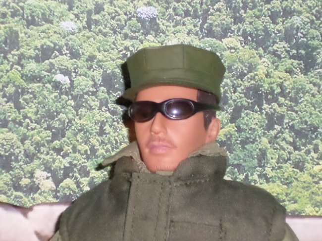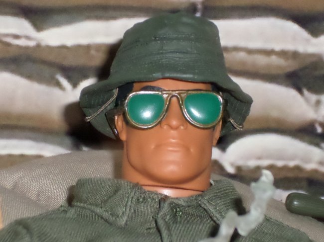 Dale Regan, a black haired brown eyed GIJ figure with molded on urban camo t-shirt, and hinged hands. / dressed in TUS O.D. uniform, molded O.D. boonie hat, black boots, Hasbro sunglasses, TUS belt, 1st gen canteen, 2nd gen jungle first aid pouch, K-bar knife and sheath, ammo bandolier, M-16 rifle.