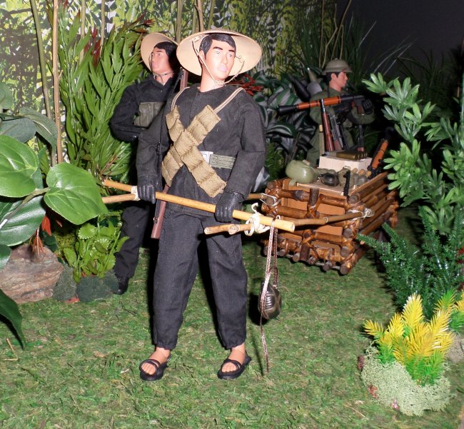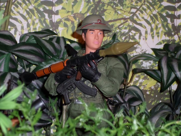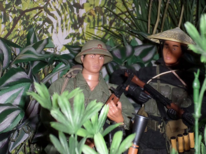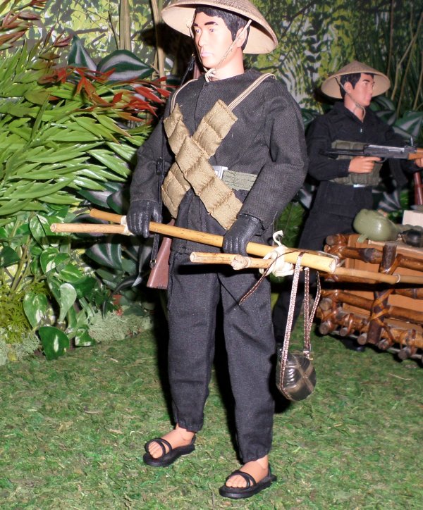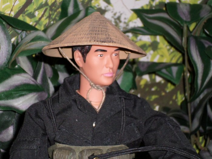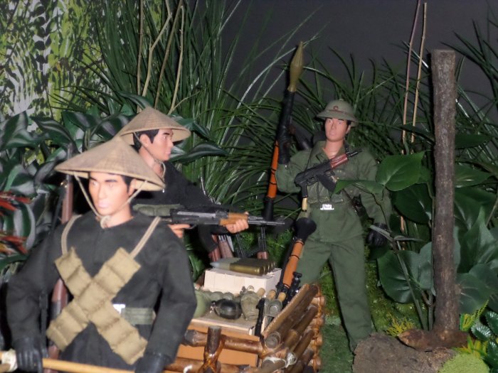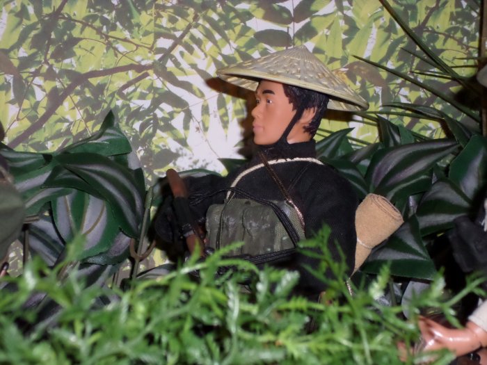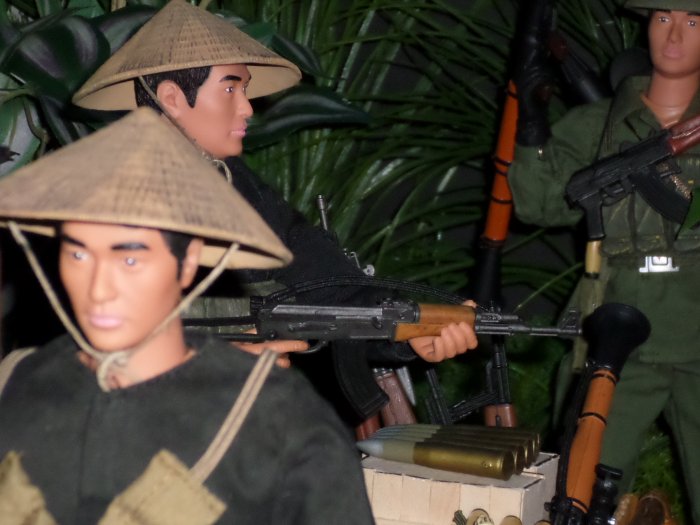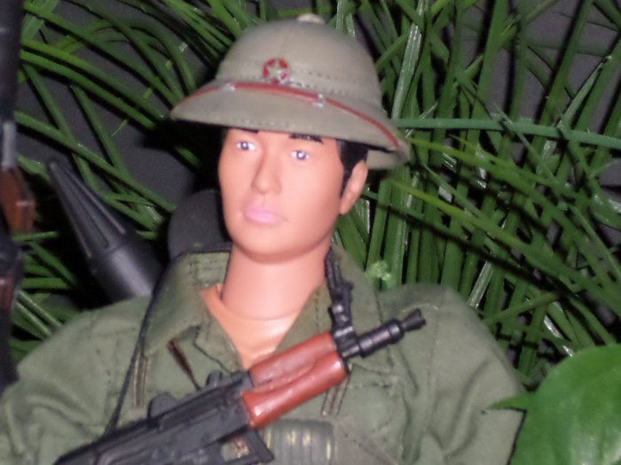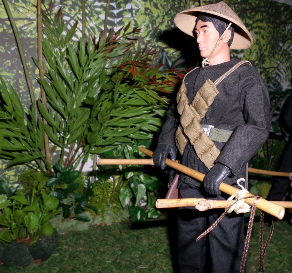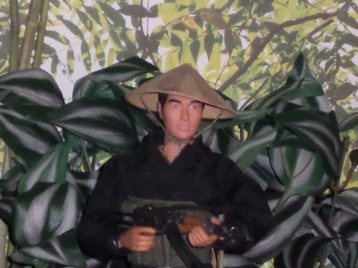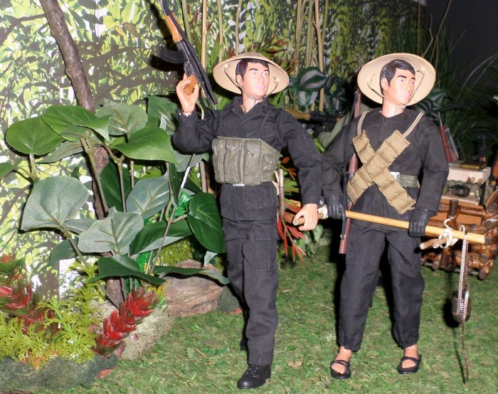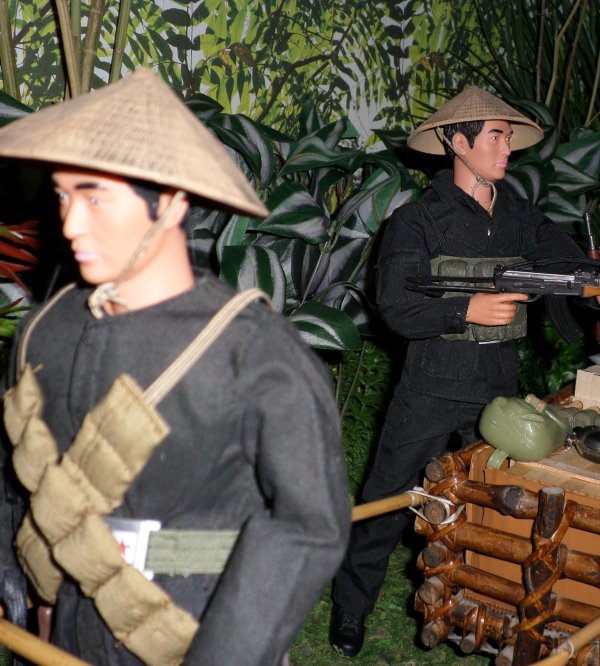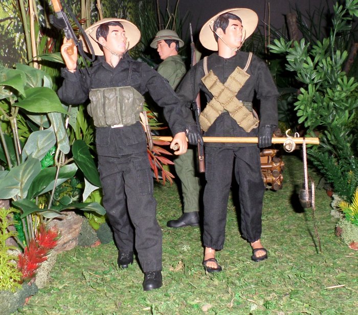 V.C. Yung Phat Ho, a black haired brown eyed Asian WP figure with black gloved hands. Dressed in TUS black pants, unknown MFG black shirt, TUS sandals, TUS molded conical hat, 2 TUS ammo bandoliers, M1 Garand Rifle. V.C. Kahn Phat Phuc, a black haired black eyed Asian WP figure, dressed in TUS black uniform, SOTW black boots, TUS conical hat, N.V.A. belt, knife and sheath, custom chest rig, TUS AK-47 with folding stock and removable 30 rd magazine. N.V.A. Sum Dum Phuc, a black haired, brown eyed, Asian WP figure with black gloved hands, dressed in TUS O.D. NVA uniform, Hasbro black boots, TUS OD NVA Helmet, NVA belt, machete in sheath, chest-rig, camo carrier with shovel, and extra rocket for RPG, AK-47 with folding stock and removable 30 rd magazine, unknown MFG RPG. |