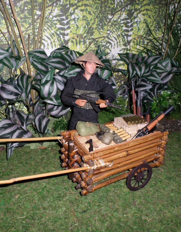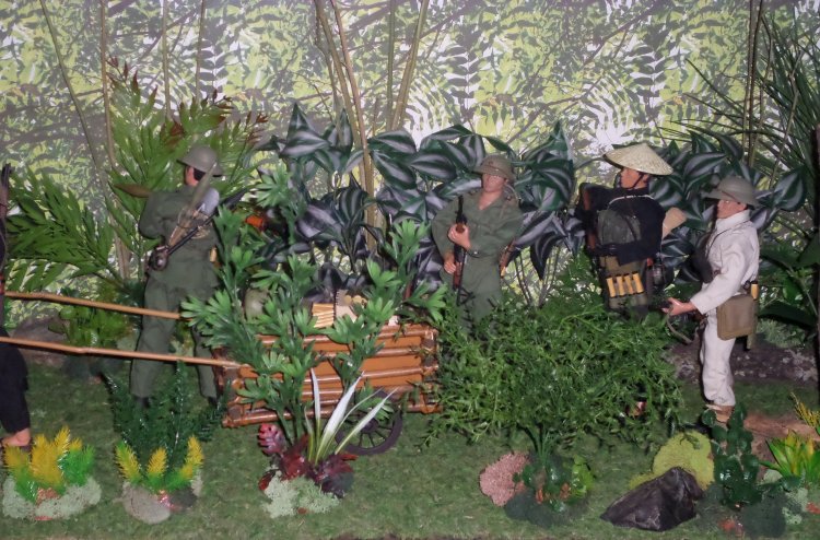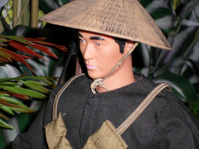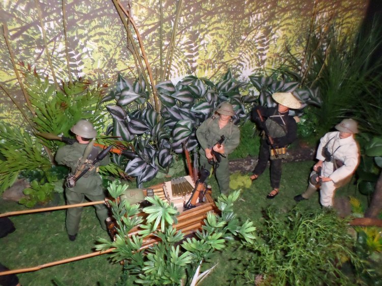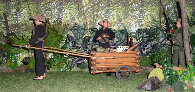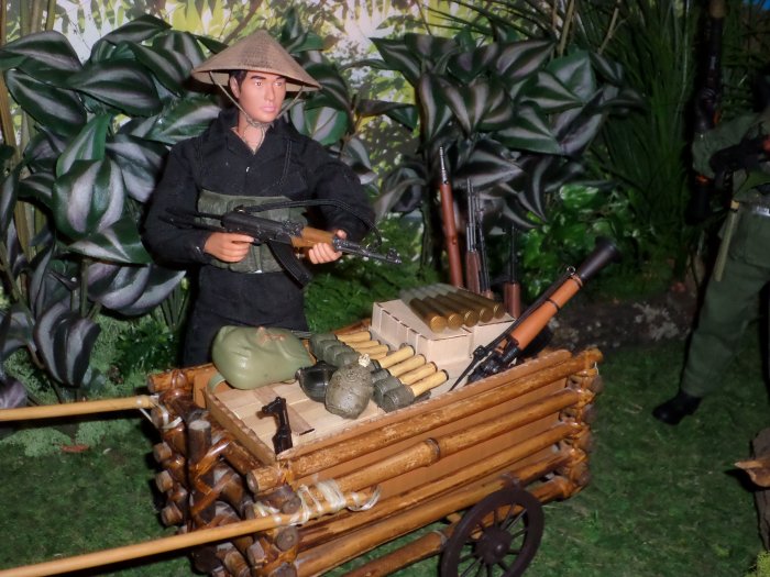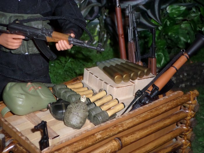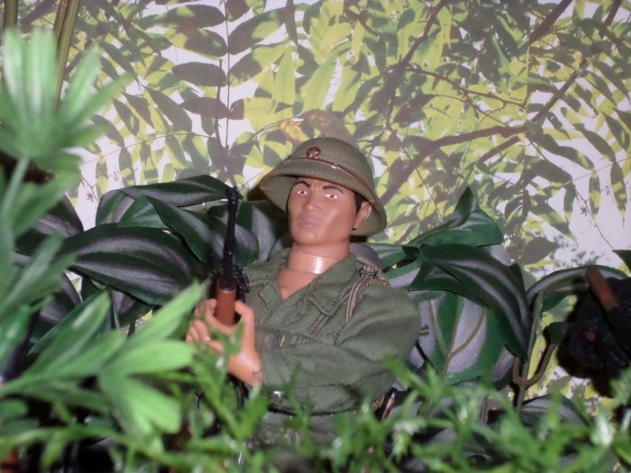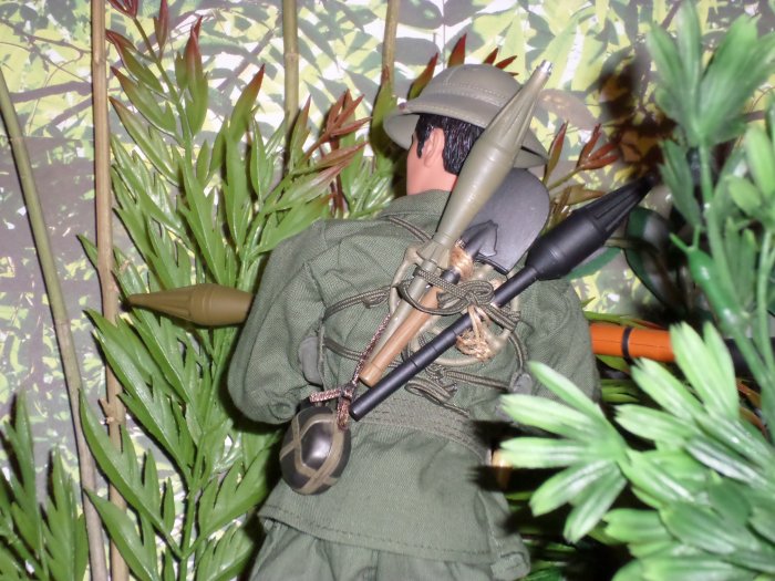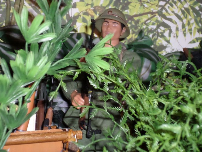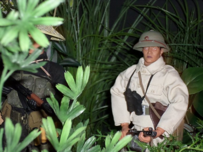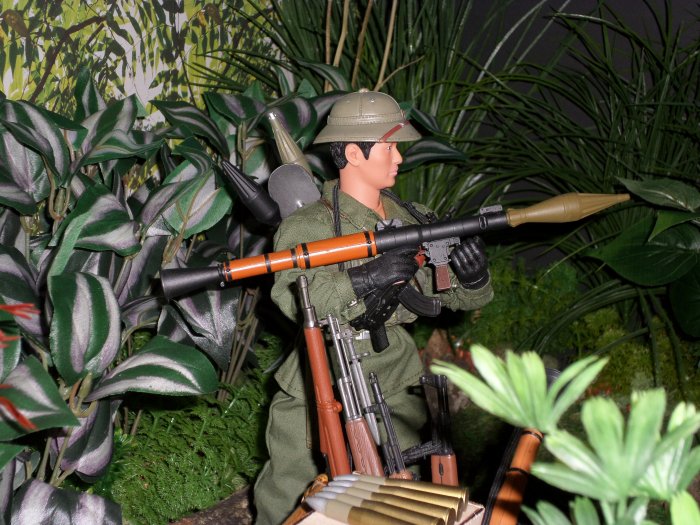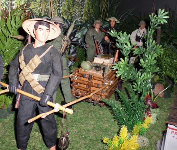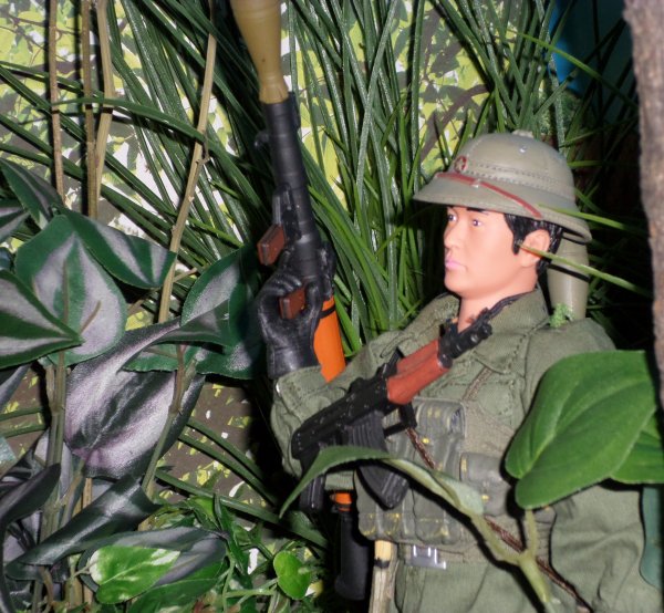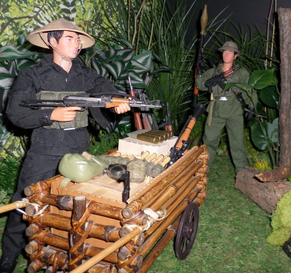 V.C. Yung Phat Ho, a black haired brown eyed Asian WP figure with black gloved hands. Dressed in TUS black pants, unknown MFG black shirt, TUS sandals, TUS molded conical hat, 2 TUS ammo bandoliers, M1 Garand Rifle. V.C. Kahn Phat Phuc, a black haired black eyed Asian WP figure, dressed in TUS black uniform, SOTW black boots, TUS conical hat, N.V.A. belt, knife and sheath, custom chest rig, TUS AK-47 with folding stock and removable 30 rd magazine. N.V.A. Sum Dum Phuc, a black haired, brown eyed, Asian WP figure with black gloved hands, dressed in TUS O.D. NVA uniform, Hasbro black boots, TUS OD NVA Helmet, NVA belt, machete in sheath, chest-rig, camo carrier with shovel, and extra rocket for RPG, AK-47 with folding stock and removable 30 rd magazine, unknown MFG RPG. |