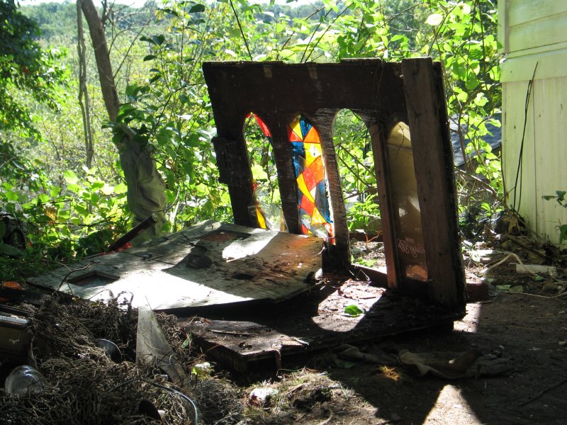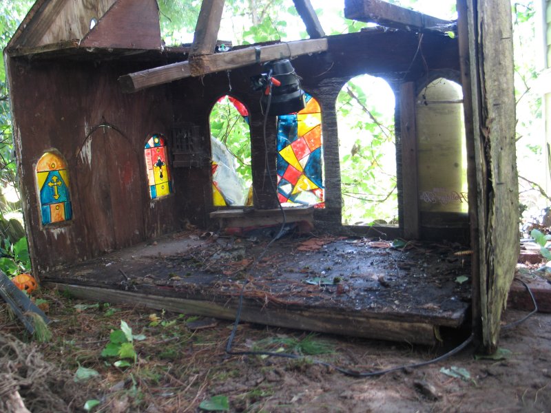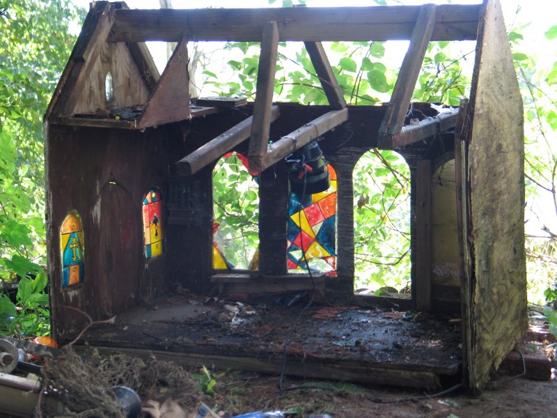 The old town of Marwencol fell apart building by building until there was just the church and Marlo Inn left standing, and those two buildings were falling apart. . . So I tore the last two buildings down to start 'fresh', because a woman across the river from me was getting her whole roof re-done and the roofers were throwing large pieces of Brand New 1/2" plywood into a dumpster so she answered the call to arms and donated all of the scrap plywood to my little folks and I !!