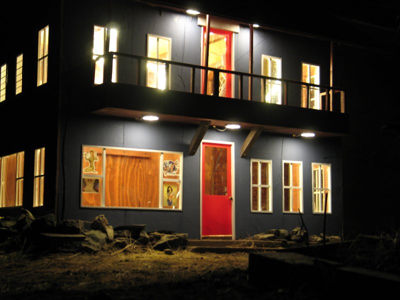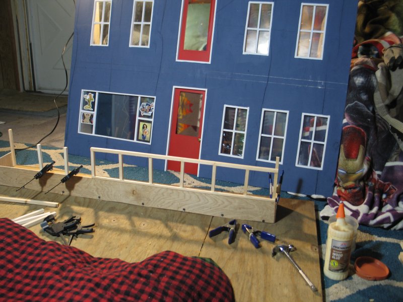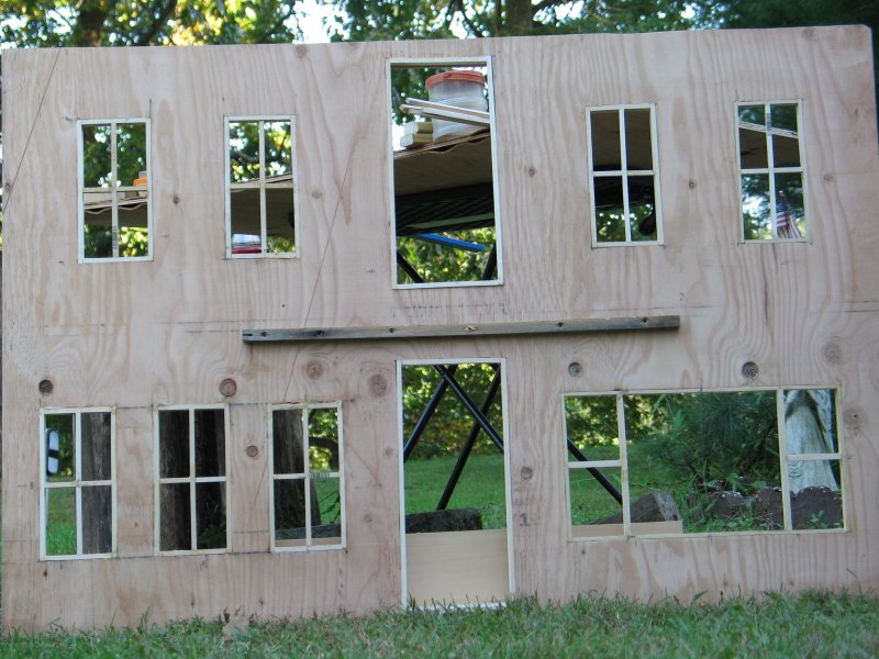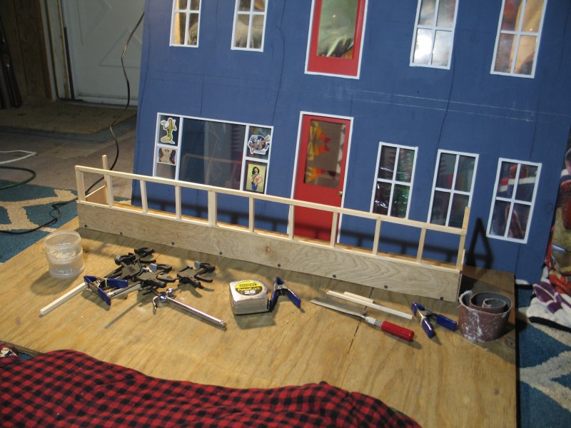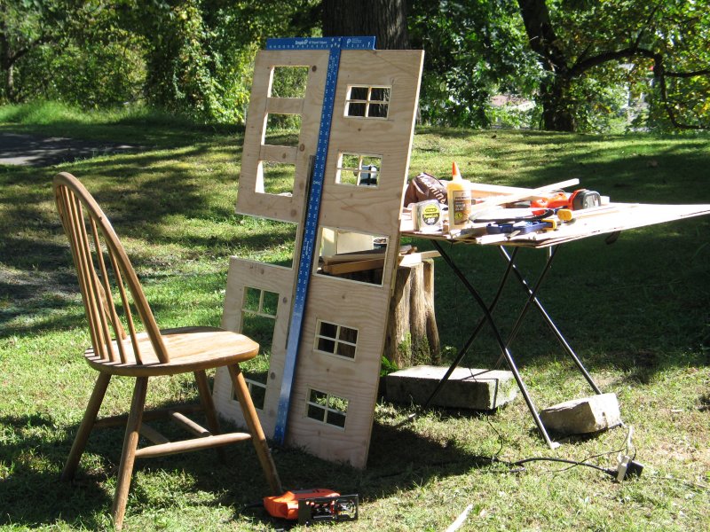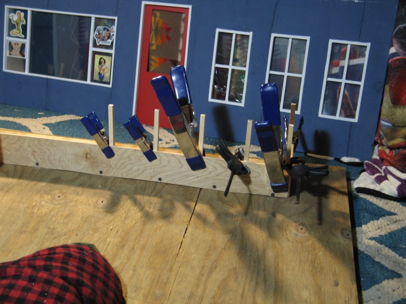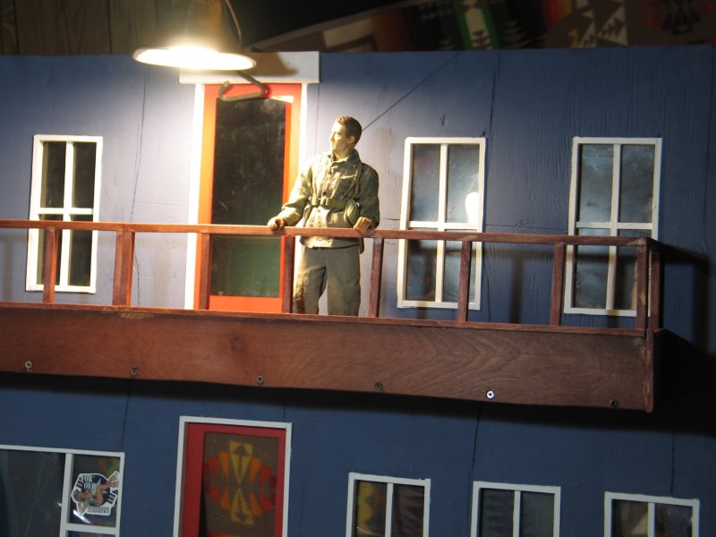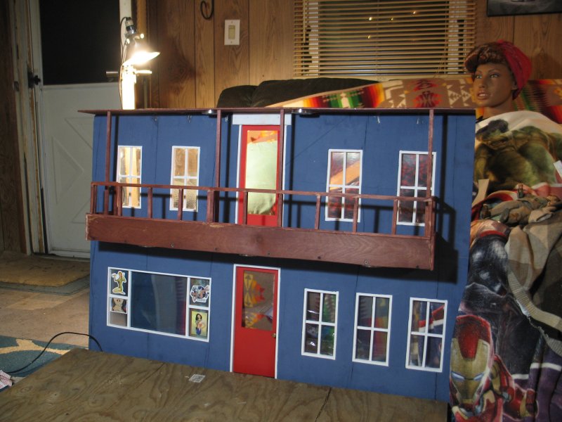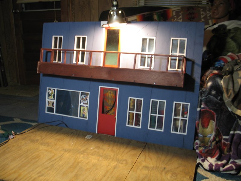 I started construction in September, and had a finished building - enough that I could work inside of it - by the end of October. I did not make any instructions nor plans on how to build what was in my head, I built everything from my imagination, and a 25' Stanley tape measure that I found on the side of the road a few years ago, and my primitive tools :) I made ALL cuts with a Jig-Saw. I took my time, and thought about how to do things that I've never done before, and I thought myself in 1/6th scale and saw things in 'real-scale' then, and I framed the windows and doors and got fancy with a balcony, and using 'under-cabinet-lights as outdoor lights for my new catfight-club :) |