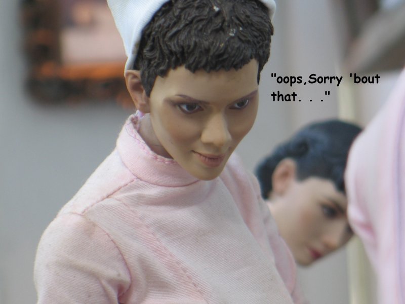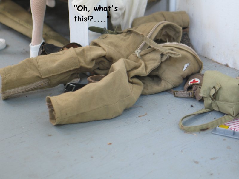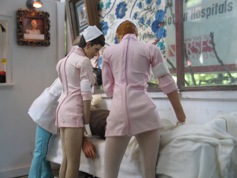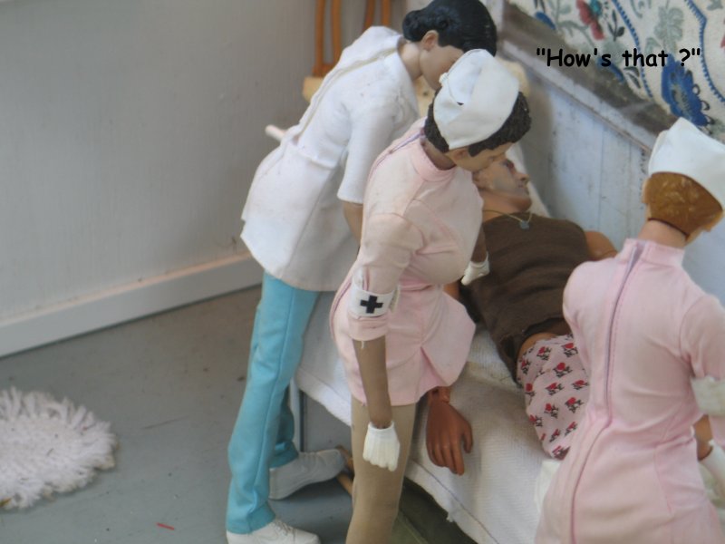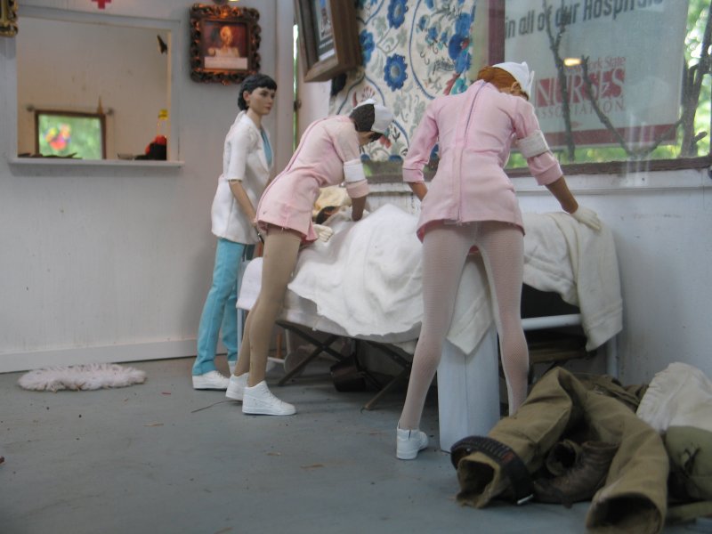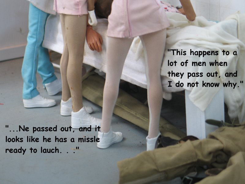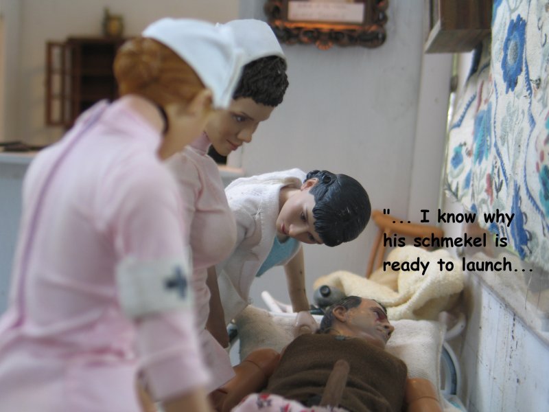 | . . . We last left Hogie in the hospital, in Marwencol. The nurses had removed Hogie's Colt .45 from it's holster, removed his gunbelt and his shoes, and now we pick up from where Hogie's just passed out. In his boxer shorts and T-shirt now, the nurses are pulling up blankets on Hogie and they notice 'a common occurrence' amongst men. . . |
