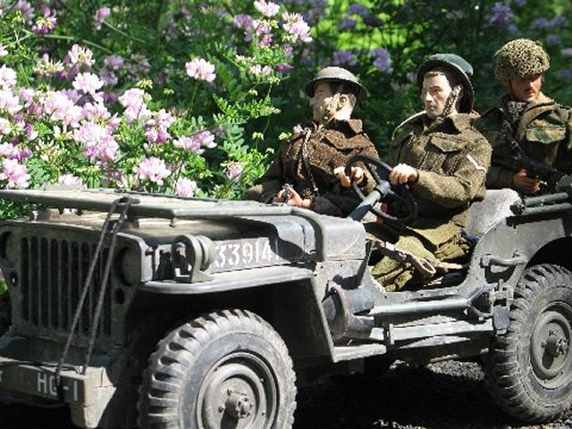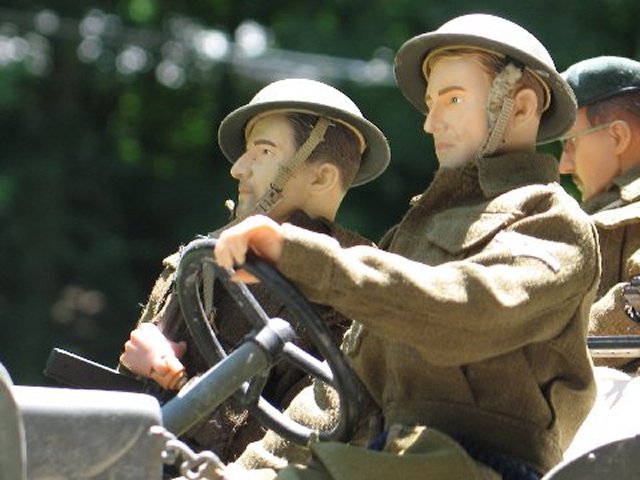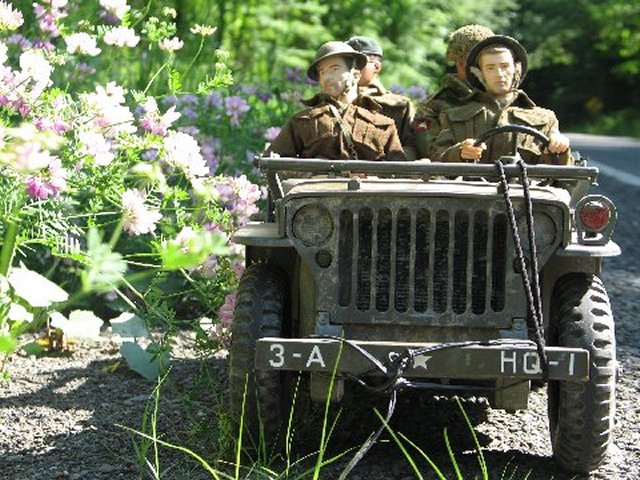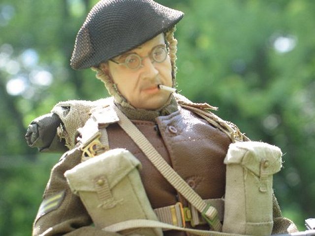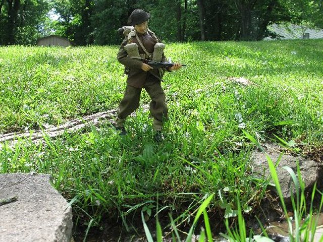 He'd never been fishing before... in his life ! Some of the British boys in town heard of this, and wouldn't have our little buddy not experience a good fishing trip. So, they piled into the Jeep, and of course Pvt. Mel had to drive, because the others were letting Mel pick his own 'good spot' to stop and throw a line in :)..... .....He landed on Sword Beach on June 6th, and was in charge of a Bren team, in which his team was separated from him, due to all of the excitement that was going on when they landed. He traveled through France first, and eventually wound-up in Belgium. His canteen was dry, and he was thirsty. Attempting to find fresh and clean 1/6th drinking water, Corporal Merry came upon a small, muddy stream. He dipped his cup into it,... and came up with tasteless, gritty, muddy water. He didn't drink it... This is the second to the last episode, before my camera stopped working... because I filmed the last episode, with the 'ol G-6 camera, in the Rain... Respectfully Yours sir, Cpt. Hogancamp |