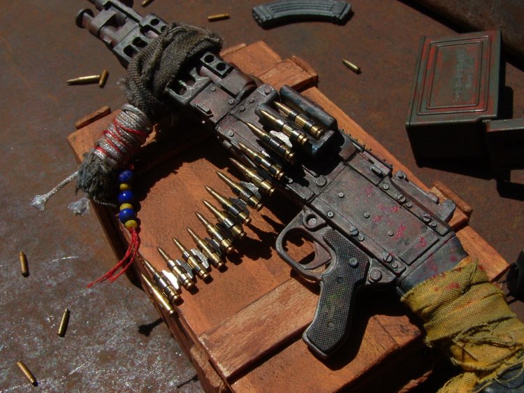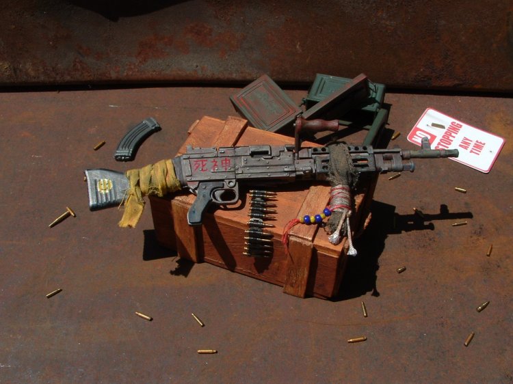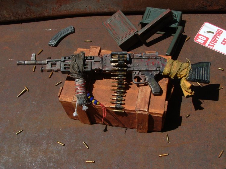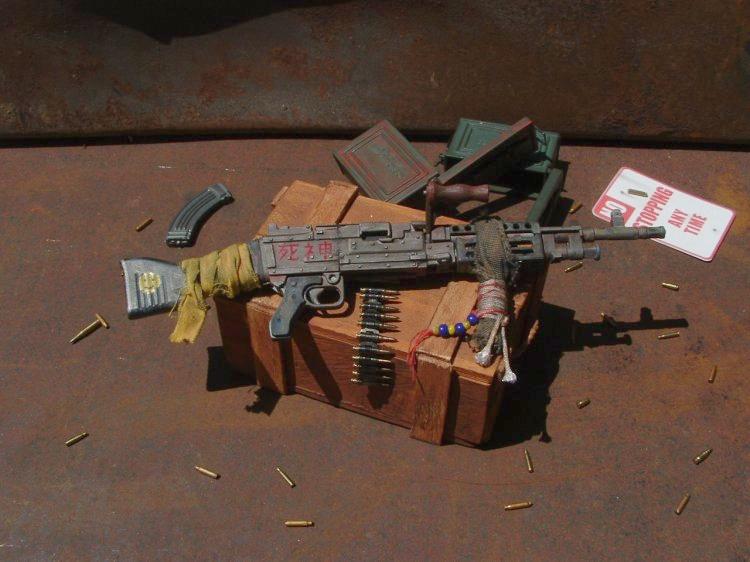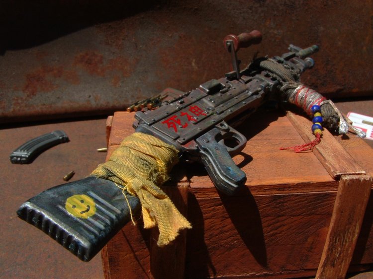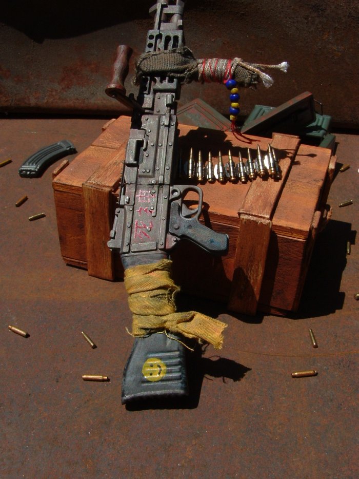 This weapon is from the same theme as the V150 (Road Kill #2) and the figure of Dave Mustaine (Post Apocalypse) The owner of this weapon has used a piece of cloth and some rope for a front broom handle. And added a few other things. The weapons named "Shinigami" (Death Spirit) (I haven't learn much Japaneses yet so I sure hope I spelled it right on the rifle!!) |