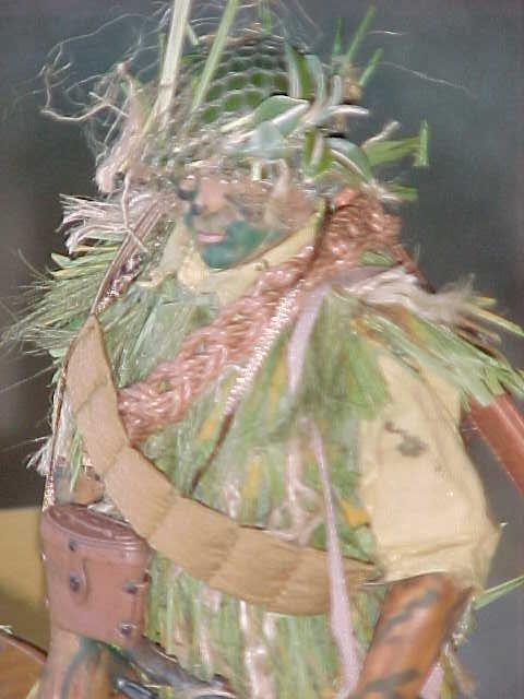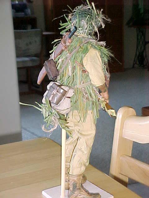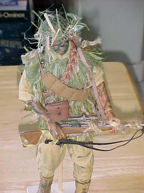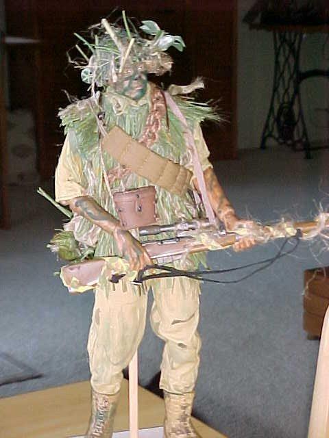 The sniper is in a grass coat, handmade by myself. He carries a Russian sniper rifle, courtesy of a conquest in the China campaign. The grass coat was essentially a Pacific island ghillie suit, made to match the long saw-grass or pampas-type grasses encountered in the island warfares.