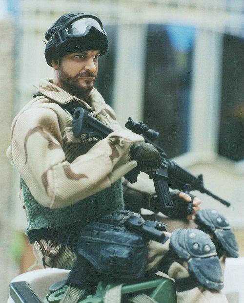The first shot is made up along the lines of an image I saw of special forces patroling Kabul in the back of a white pick-up truck. This soldier has a custom painted face and a ammo waist rig that I hand stitched to match the photo. All the gear in this shot is 21c with the exception of the small maglight on his drop down holster. |