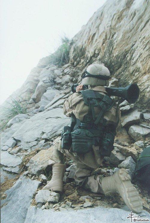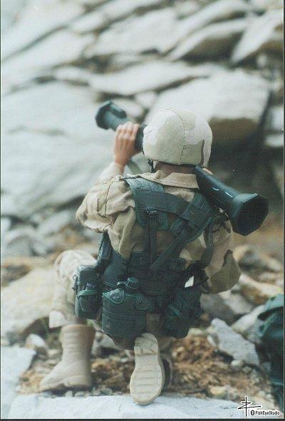 | The next two shots are of a soldier firing an AT4 rocket at a suspicious cave opening. The first is shot with a normal lense (in this case since I am using a 35mm camera the lense is a 50mm). The next shot is of the same set up but I used a wideangle 19mm lense. If any of you haven't tried using a wide angle for close up shots of your troops, you should try it out. |