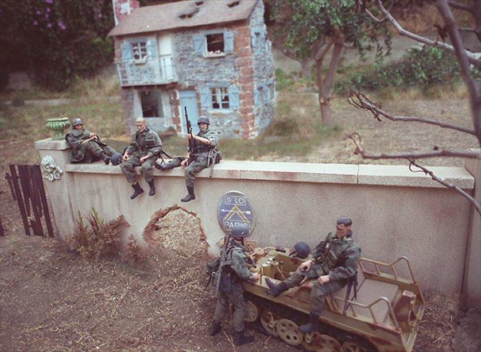 | Fallschirmjagers take a break during a lull of the Normandy campaign as they hang out at a Norman wall of a farmhouse near a French village several days after the allied landings. |