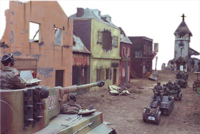 | Members of the 12th SS Panzer Division Hitlerjugend including a Tiger tank retreats, passing by a group of small business buildings in a Norman village days after the allied landings. |