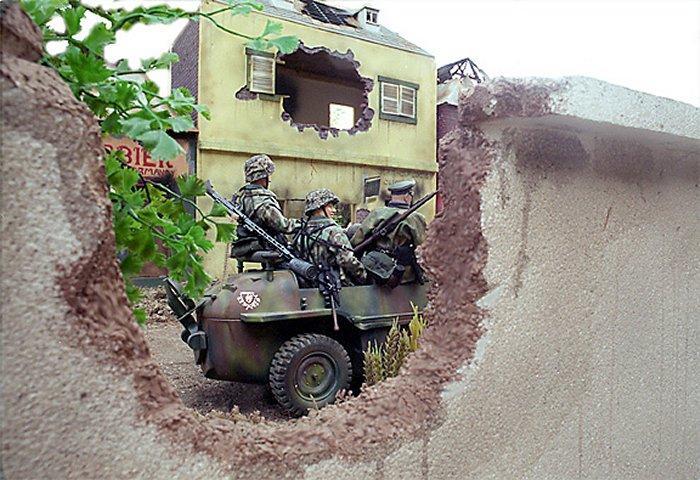 | A view from the blown out Norman wall of the farmhouse shows a machine gun crew of the 12th SS Hitlerjugend passing by a two story building of the village. Its front upper wall also blown out. Note the divisional insignia at the back of the Schwimmwagen. |