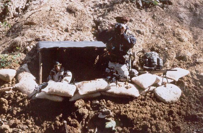 | Sgt. Cooper answers the radio and tells the Recon squad to cross the river to the South of the OP because there are mines to the North of the OP position and they took some sniper fire from the North yesterday. |