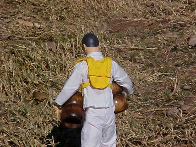 One sailor leaves to find fresh water, carrying his water barrels.
