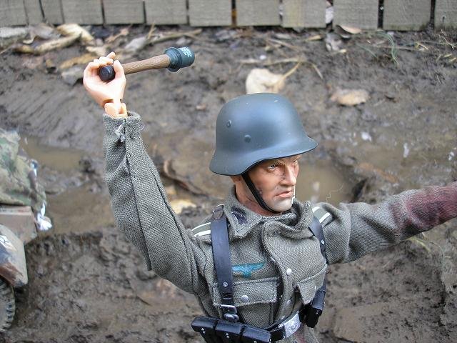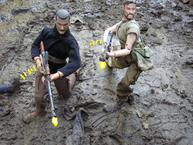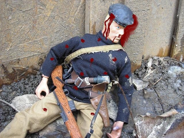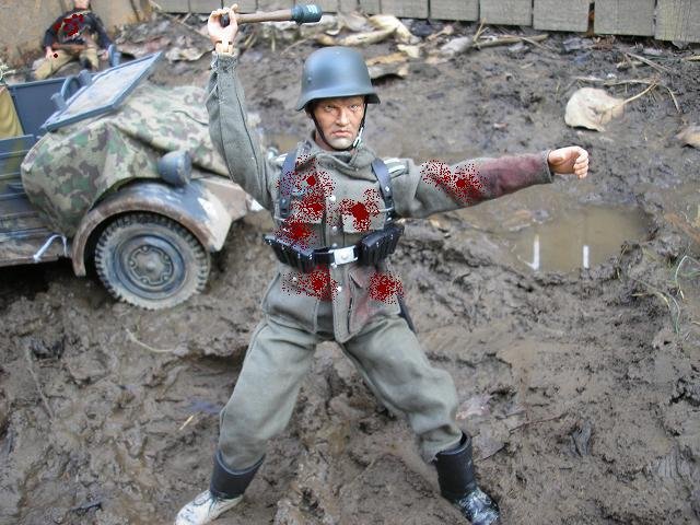 | The Nazis gunned down the guard at the gates. We stood firm and gave them all we had. One soldier drew a grenade and we took him out, the grenade fell and exploded, destroying the kublewagen full of explosives. The Geman medic surrendered to us but Gil killed him; executing him in front of us all. I feel that he is going a little off the deep-end. |