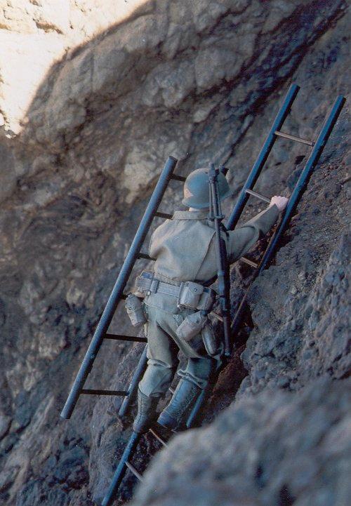 Ranger going up a tubular ladder, one of the ways they got up.