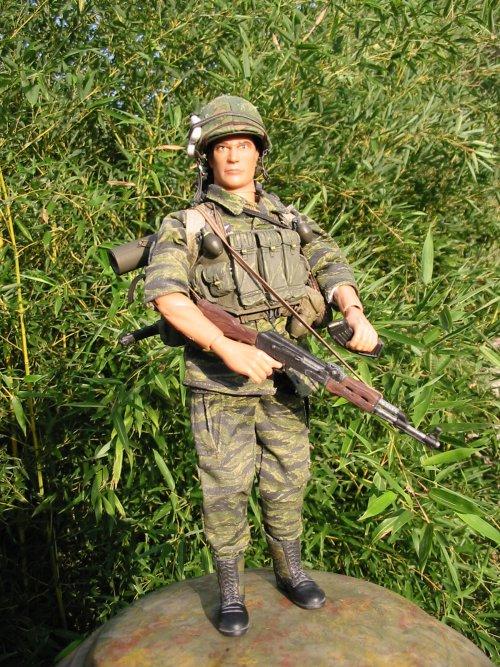| Here is one of my first kitbashes from a while ago. This figure reminds me of my Scout Master, although he was 3rd force recon U.S.M.C. instead of Mike force. The kit is pretty much the same as I remember from his pics from Vietnam with the exception of the O.D.s that he wore instead of tiger stripe. |