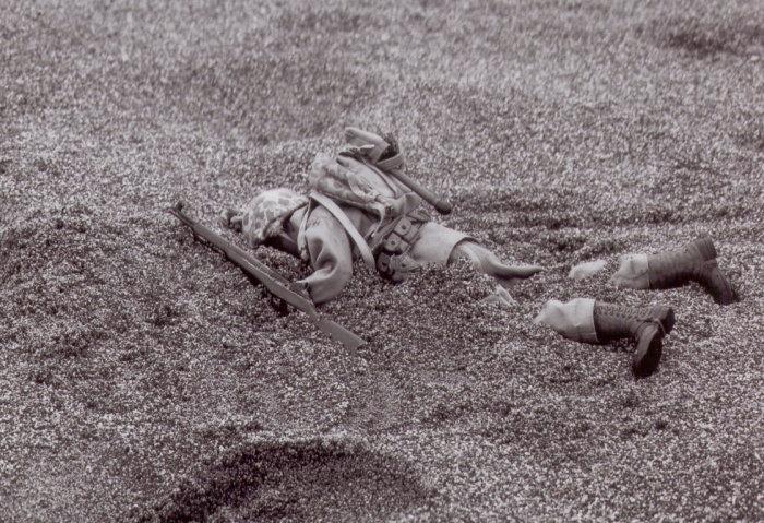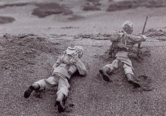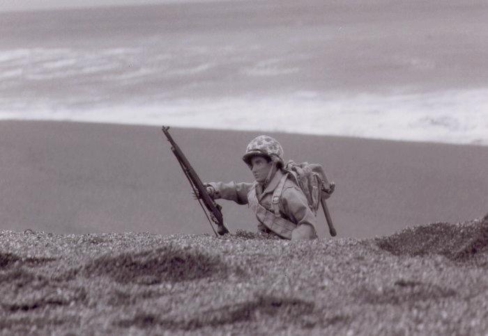 Marines take cover on the beach.