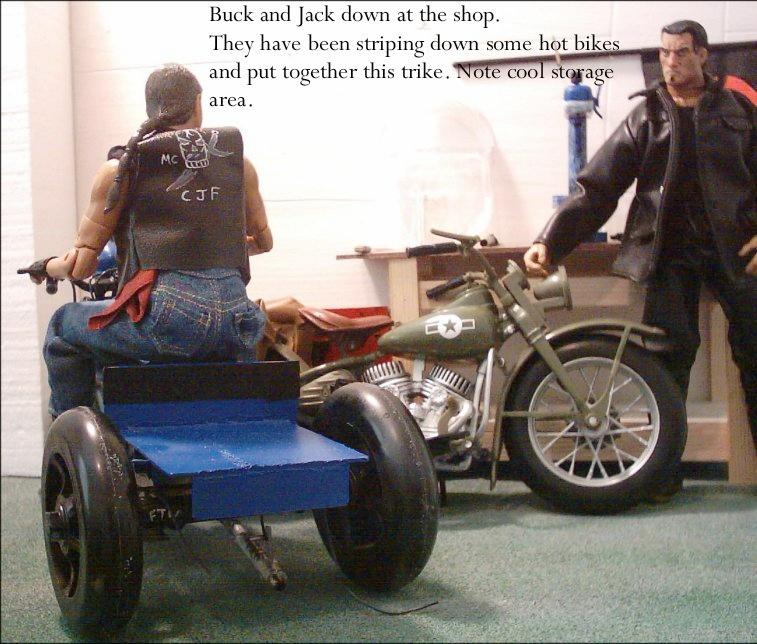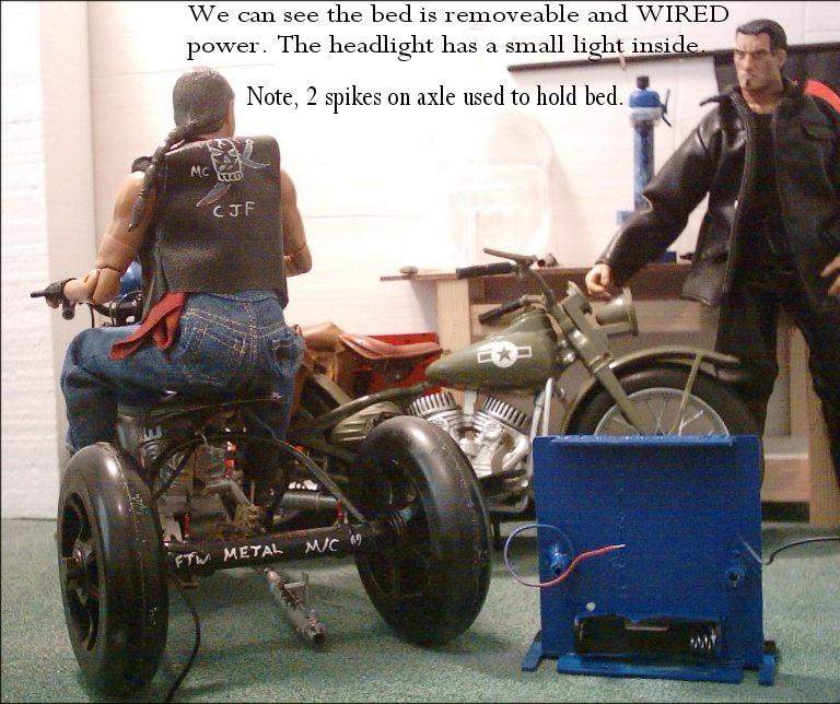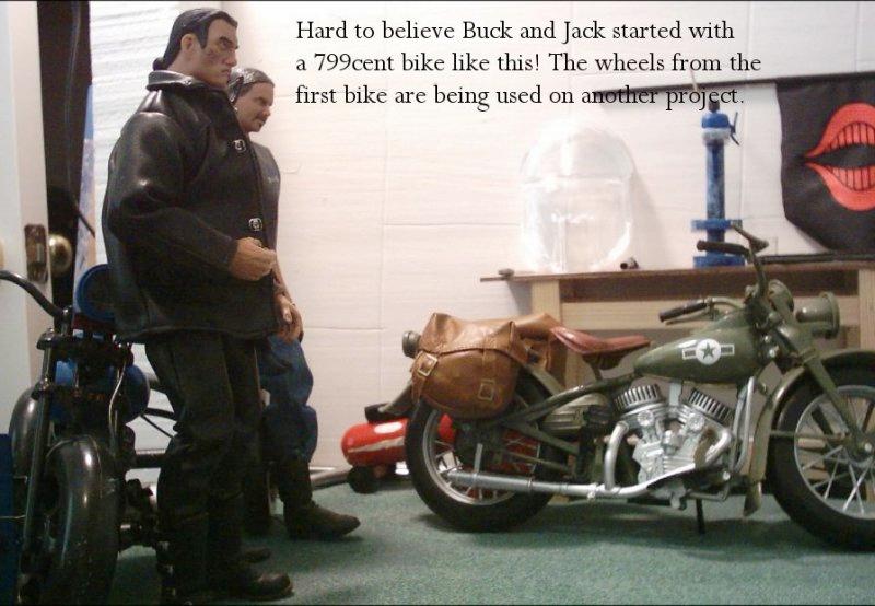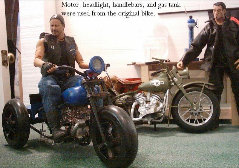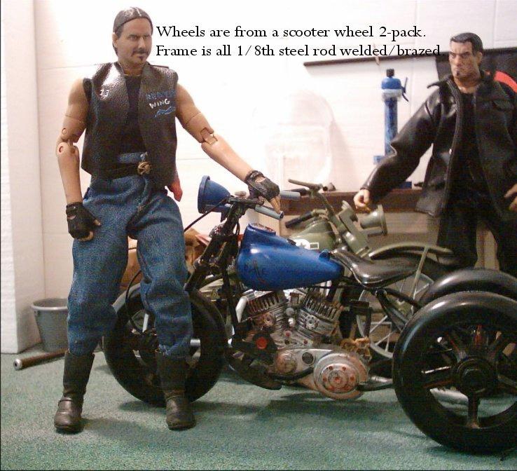 | Here are some photos of another one of the homemade motorcycles that I have made. Again it is a steel rod frame, bent and welded/brazed by me. The frontend is two cast pieces to make up the triple trees and steel rod for the forks. The careful eye will see that the motor magically has part of the frame running through the rear cylinder... Well that was because I built the frame before getting those cheap motorcycles from Big Lots. The good thing is that faux-pa allows the motor to stay in the frame. Jack and Beech just seem like the guys to be doing this kind of work, hence the reason they are used. |