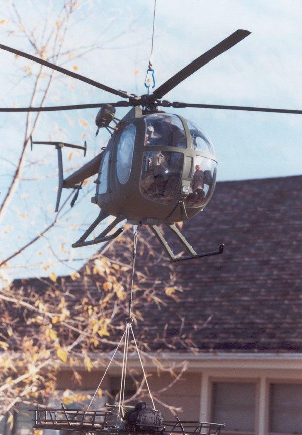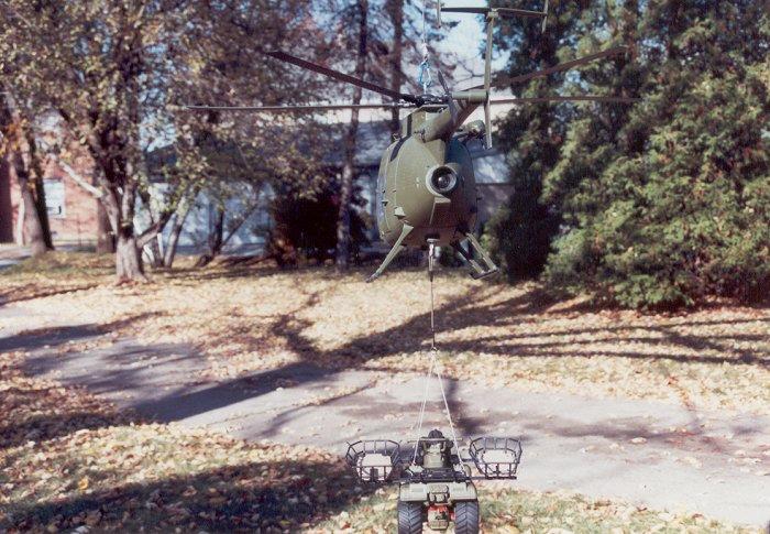 | A downward frontal view of helo w/ slingloaded ATV. Co-pilot checking map to locate the DZ. |