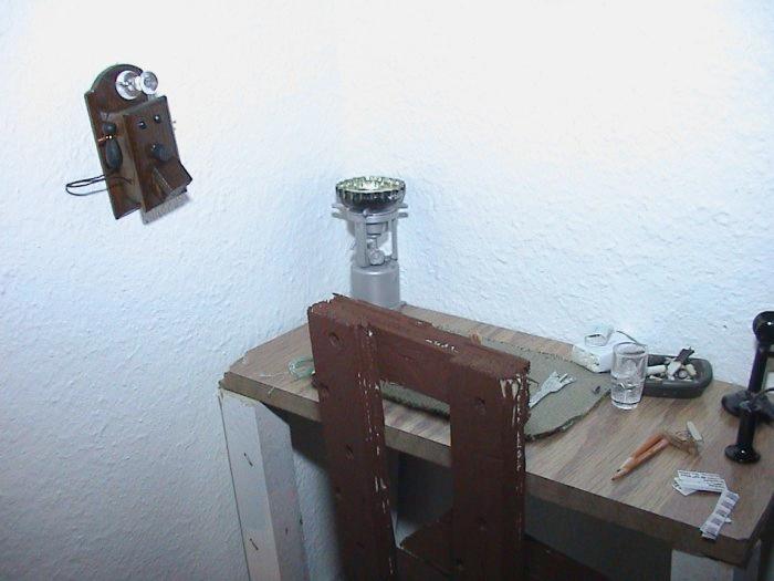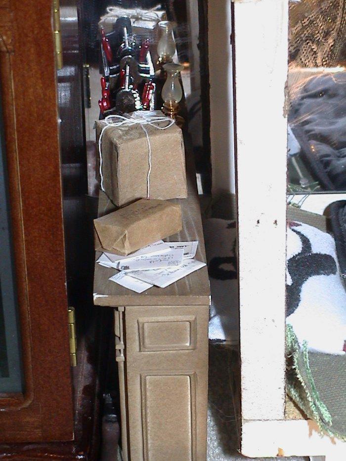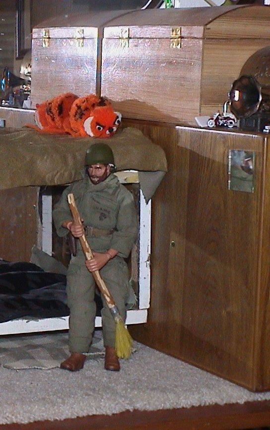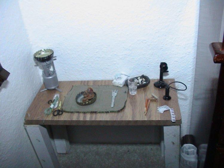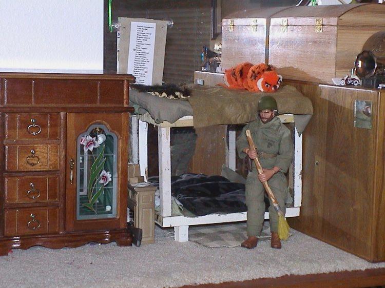 | This is my GI Joes house\apartment. The mail, canned food, rations, Spam, pencil, desk, shaver, soap, bed, mattress, blankets, Band-Aids, tie, cigarette buts, match box, cig pack, broom, toothbrush, chair, newspaper, thread, stamps, return addresses, placemat, jumper cable, lighters and licorice were all hand made by me. |