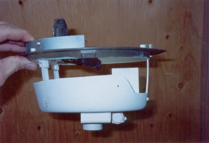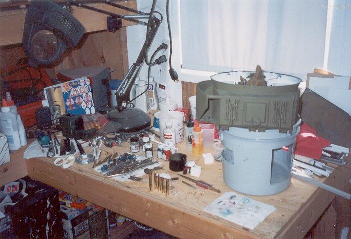 The turret upside down on it's stand waiting for basket installation among the chaos of my workbench.