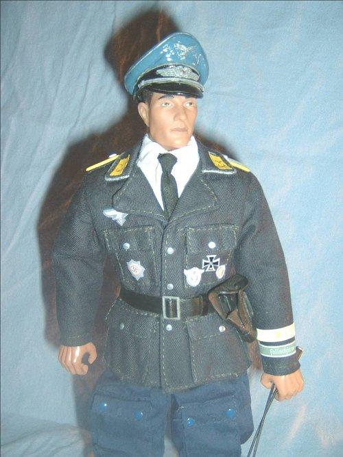 | This is my Luftwaffe pilot on standby. His officers tunic is made from a 21st Heer tunic dyed and decked out in Luft insignia and colors for flying. He wears the Iron cross first class and wears the cloth versions of the Fallshirmjager badge, Pilots badge and German Cross. He was at Crete (cuff title ) while a Fallshirmjager. Some of these guys were also pilots later in the war. |
