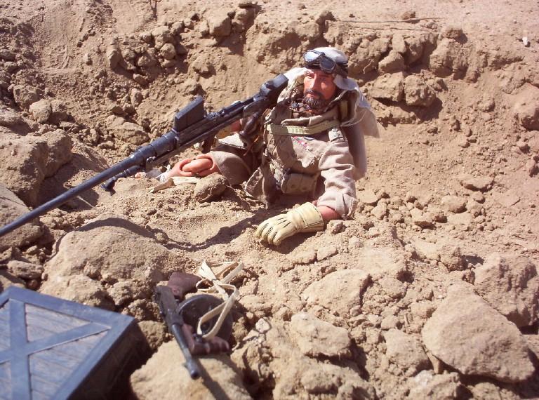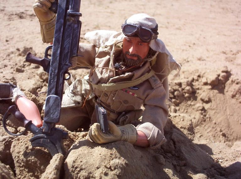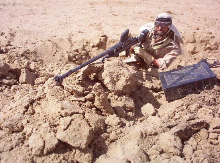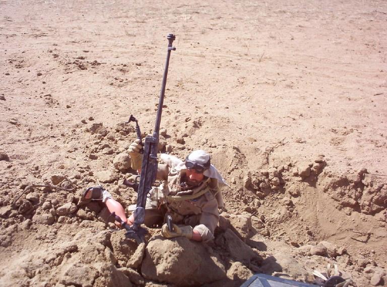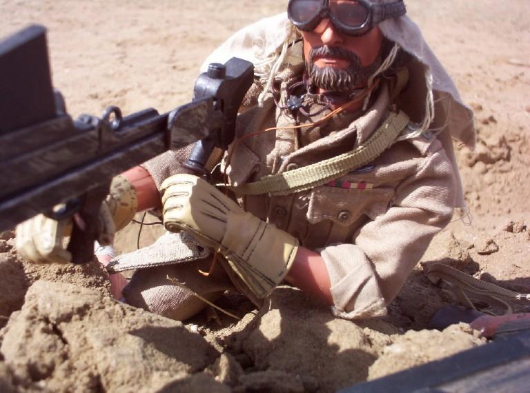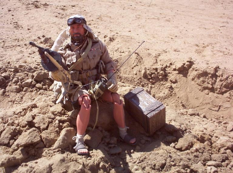 | Here is Captain Caldwell in Africa demonstrating a few things for us: the forward observing and use of the radio for the SAS, but more importantly the BOYS anti-tank gun (a 21st piece from the WWII spec forces blister pack). Used primarily by the brits and US Marines, this .50 cal weapon gives the kick back equivalent of shooting 6 12 gauge shotguns off at once. Now thats a gun! |