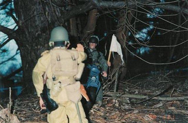 Pvt. Phillips: "Stop!" Capt. Hiesser: "Ve are here to see za Commander of your battalion." Pvt Phillips: "Why?" Capt. Hiesser: "Ve have orders to give him a message." Pvt. Phillips: "Then ya'll folow me." |