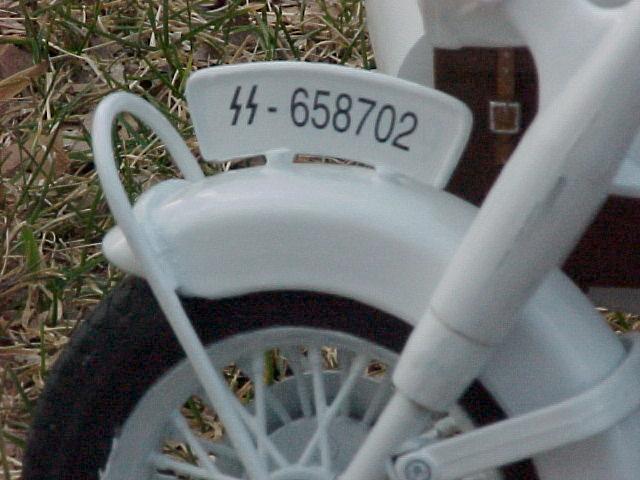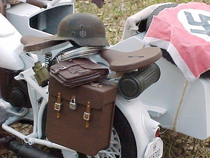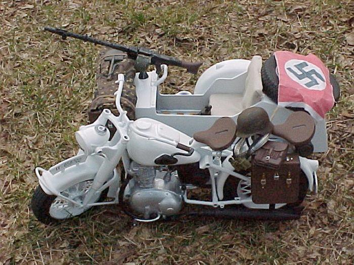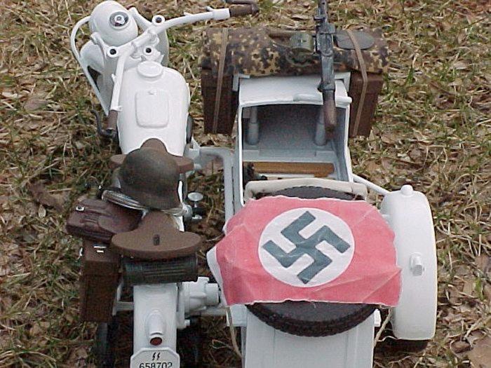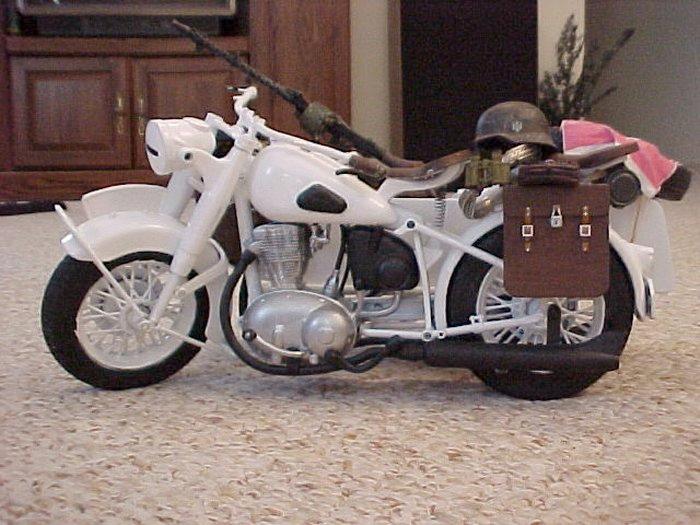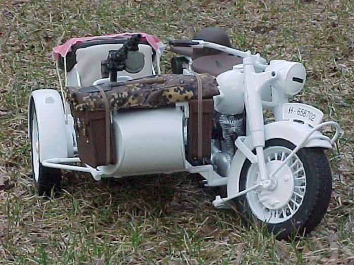 | This is a standard TUS German Motorcycle with Sidecar that I bought in "so-so" condition and decided it needed a little TLC. I was browsing through "SS - The Secret Archives, Eastern Front" and found a photo with a motorcycle with sidecar that had been whitewashed and decided to do something similar. Here is the results. I really had a blast fixing this thing up and a special thanks goes out to our friend Flip who generously supplied the decals for this project. Enjoy. - MacV Recondo |