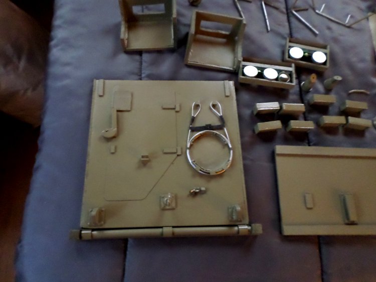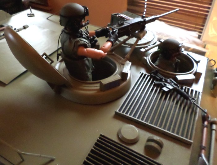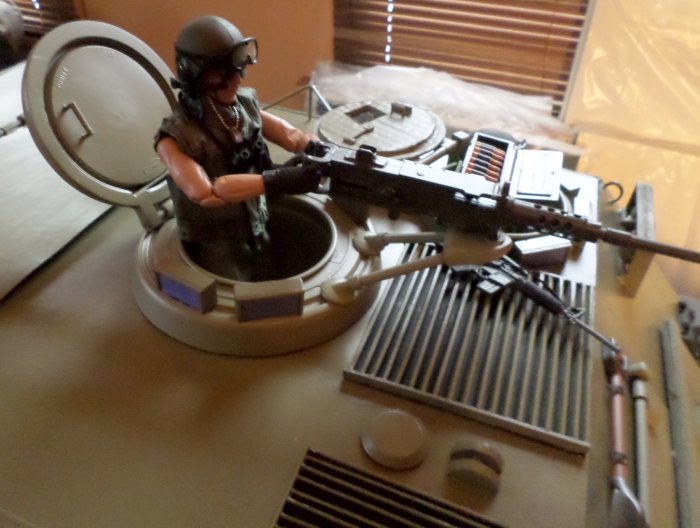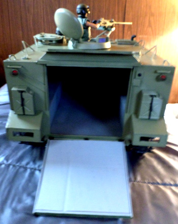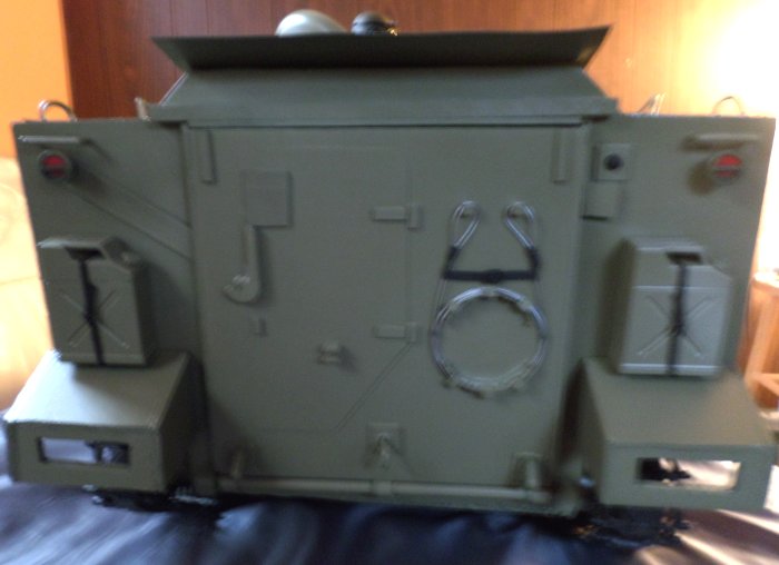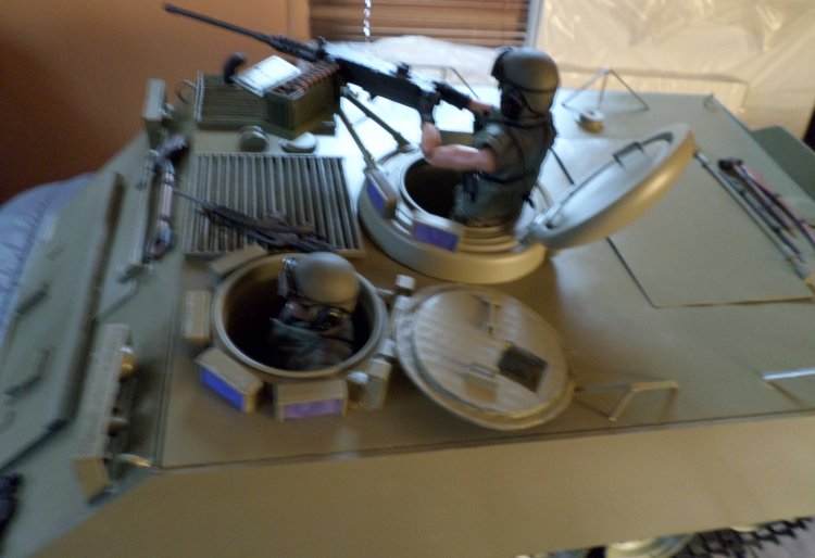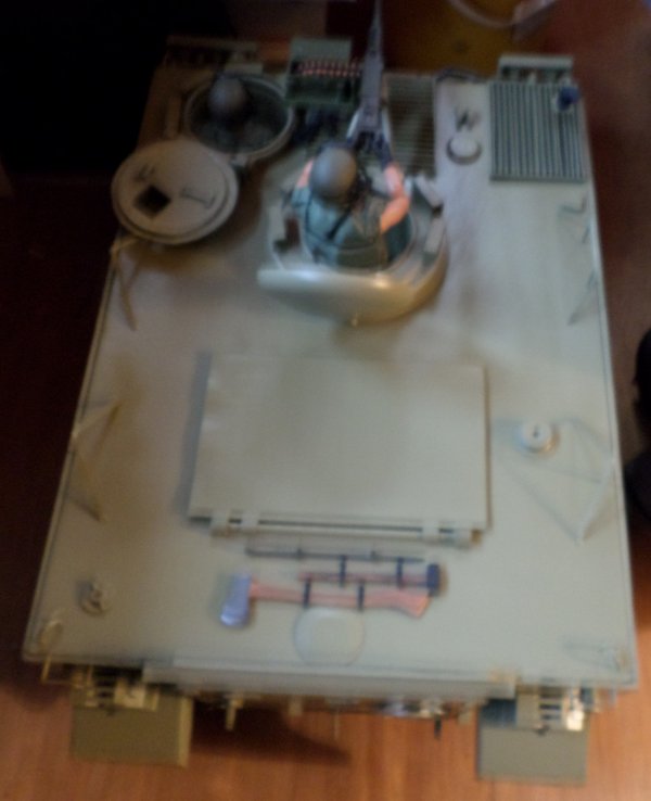 | Now it's 2018 and in mid-April it is what I would call complete, just some small details left to do, if I decide to do them, like I said before, it only has to be good enough for me, I also decided not to do the interior, other than paint, so I would save time and headaches. The driver's hatch opens and closes, as well as the commander's, which also rotates, the large hatch on top also works, and the ramp in the rear opens and closes |