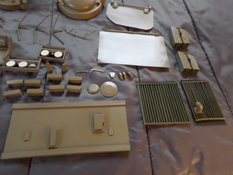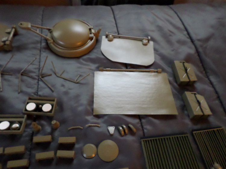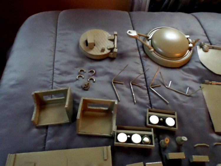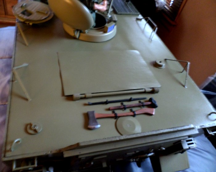 | In December 2017 work resumed, the engine louvers were made out of Popsicle sticks, exhaust pipe is a copper tubing elbow that I cut at an angle, the rest of the detailed pieces were made from small bits of wood, cardboard, plastic, foam core, sculpy clay, and whatnot, and a lot of trial and error. Some pieces I had, (.50 cal. Machine gun, fuel cans,) some, like the lights, shovel, axe, and stuff, I got from eBay, or Justice Fighters. |