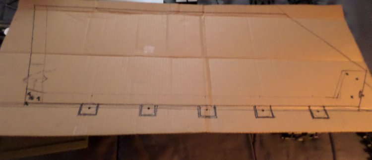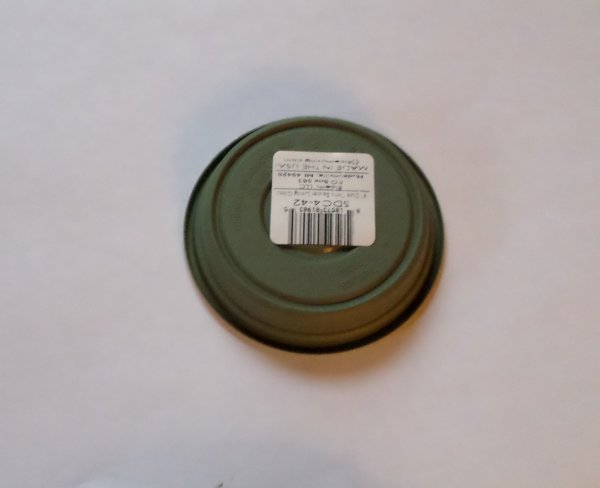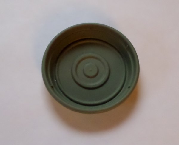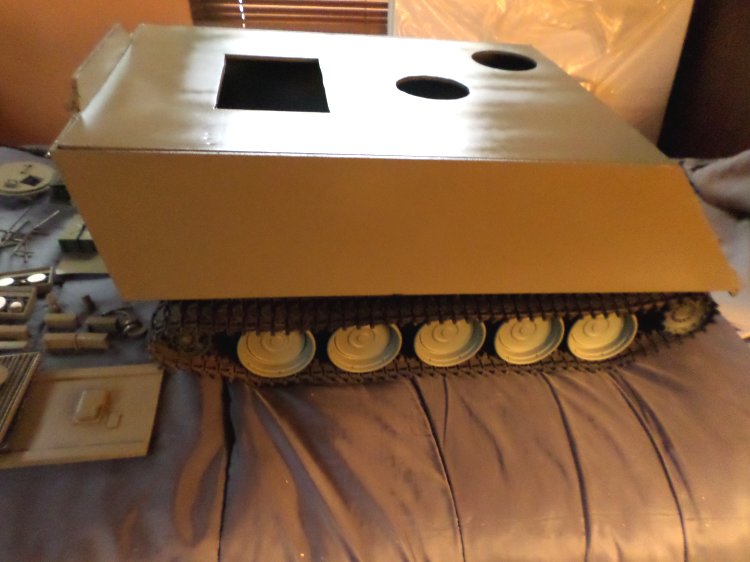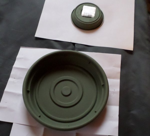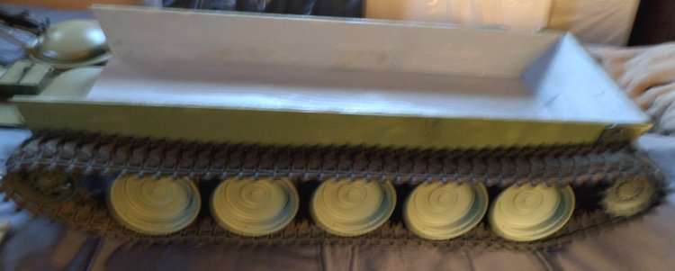 So now I decided to use foam core for the hull of the vehicle, for a smoother surface than cardboard, so in October I got a couple of large pieces of it and shortly after that, Paul had finished making the hull, top, and rear hatch cutout. I was surprised at how fast he did it, and how nice it had turned out. (Paul is the king of level, plumb, and angle to the dangle.)The hull and chassis are not permanently attached so it will be easier to move around, and who knows, I could build something else to sit on those tracks. Now I had to figure out what to use for the hardware store for $1.00, after Paul cut it with his angle grinder and some sanding, I had a driver's turret ring and the commander's hatches, and engine louvers.... And the project stalled, till summer of 2017, when Paul found a 4" P.V.C. pipe cap on sale at the hatch top, but I still needed something for the commander's turret, like an upside down dog dish, large ashtray, or something like that, the search was on... in the fall of 2017, I found it, the same planter saucer, but in the 8" size, but it didn't look quite right, after cutting the upper ridge off, for a more suitable profile with a Dremel tool, it was done. |