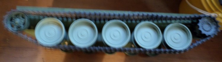 By this time, my bother Paul (who kindly lets me live in his house for low rent) noticed what I was doing, and looked at my drawing, and we talked for a while about the hows and whats and stuff. I showed him the 1/35 scale model, and some drawings I printed from the internets, 2 days later he had made a frame out of wood he had ripped from a short 2x4. We mounted the wheels, sprockets and idlers, the tracks fit, and looked GREAT!