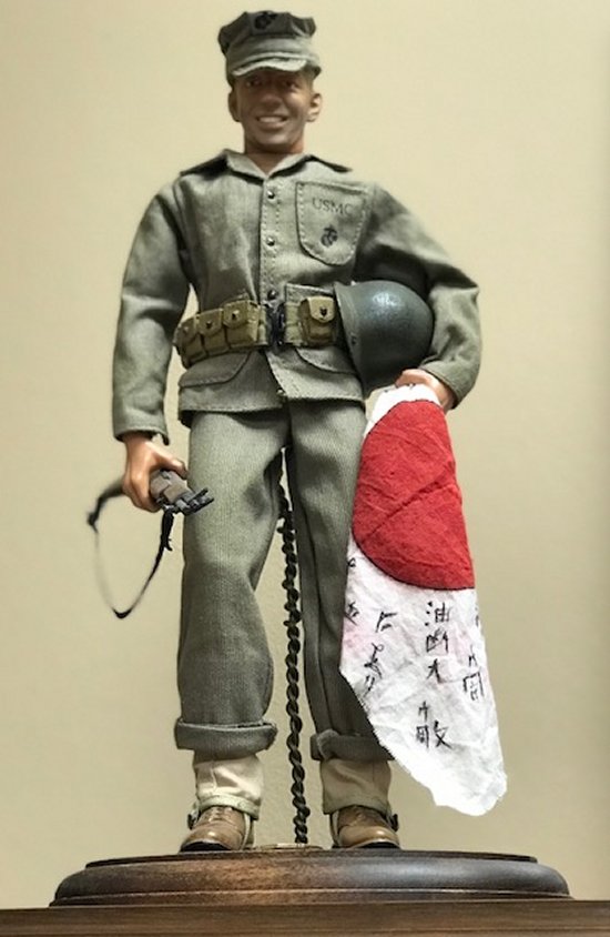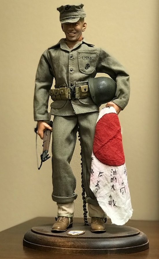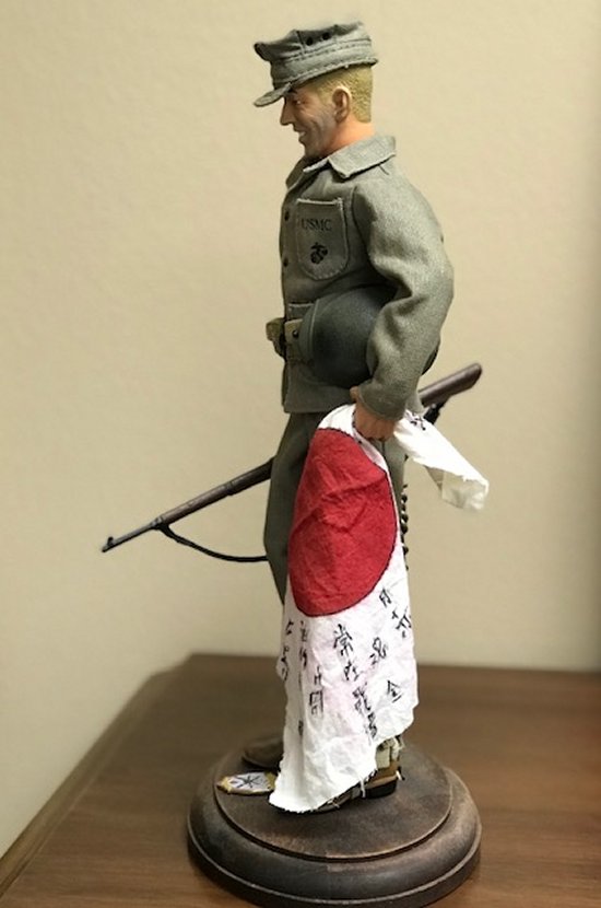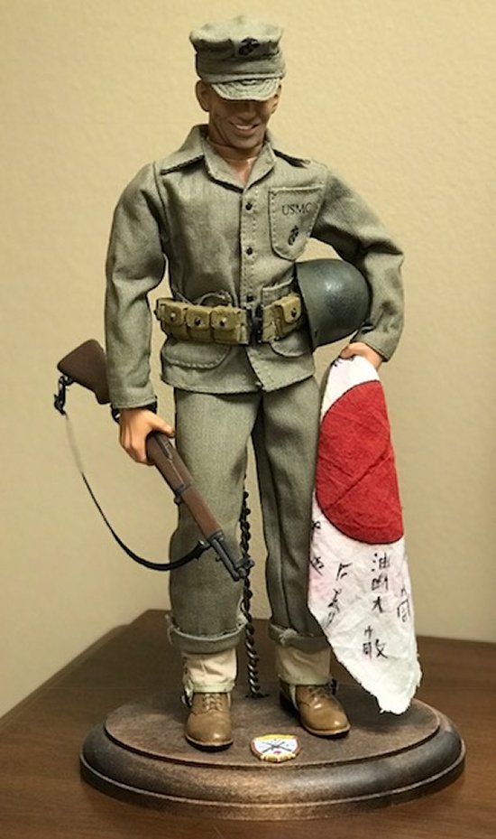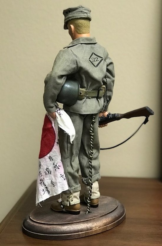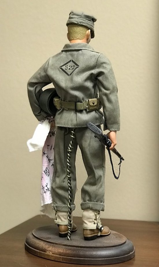 Here are some pictures of another all Ultimate Soldier kitbashed figure. This figure is a combination of the Navy Seal Night Ops body, 1944-45 USMC uniform set, and the 29th D-Day figure cartridge belt, rifle, and helmet. I made the Japanese good luck flag out of an old hankey and some pens.
