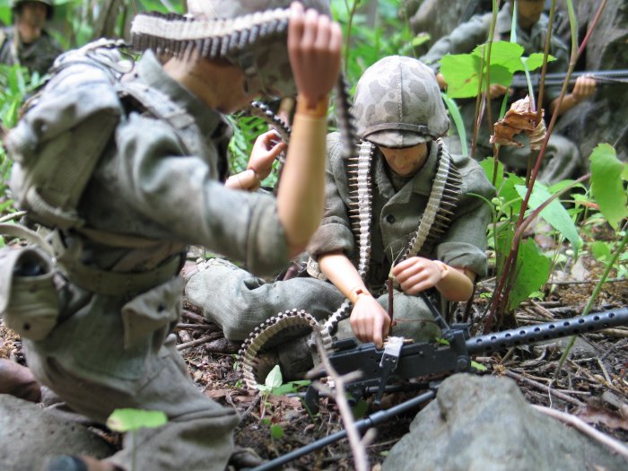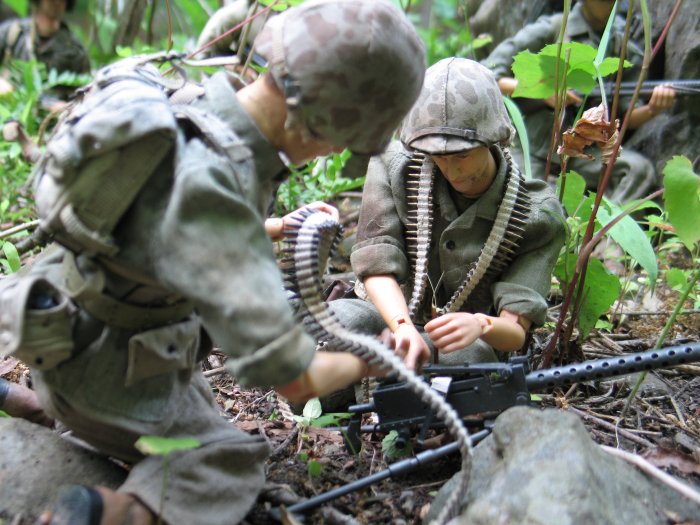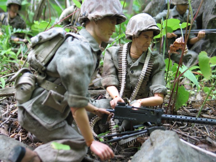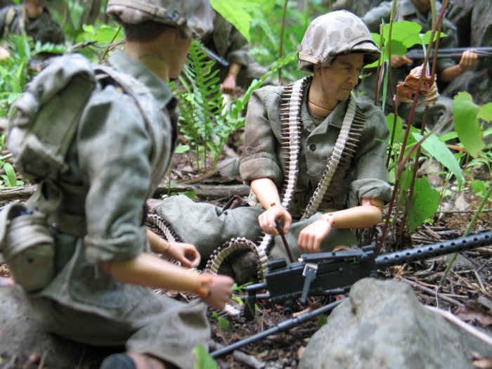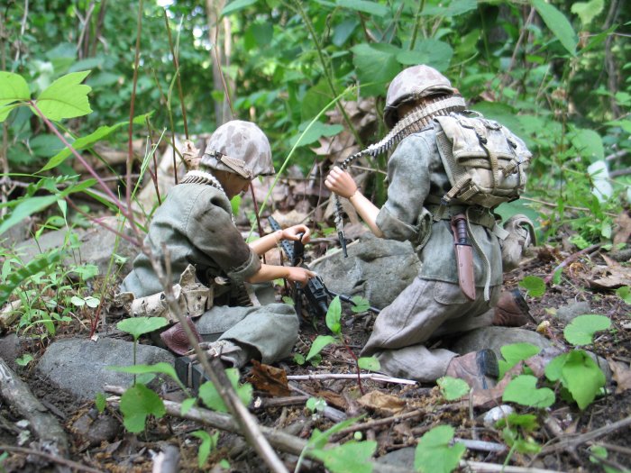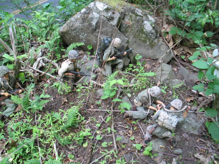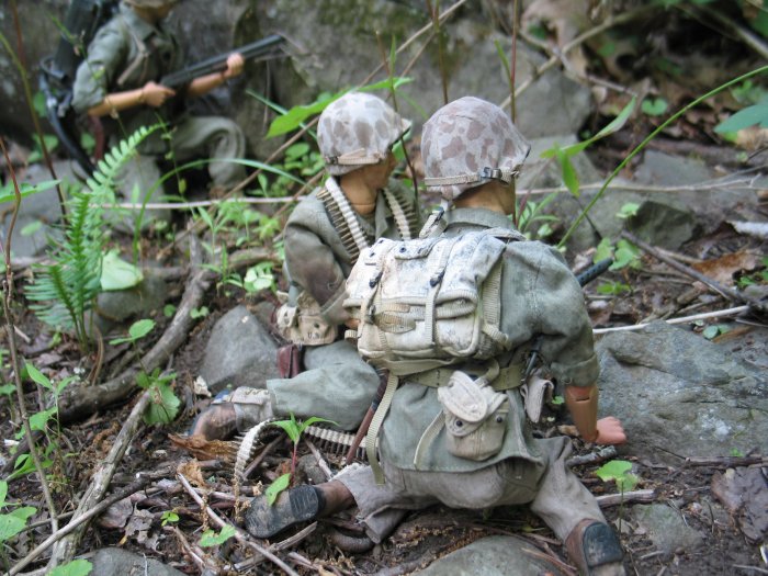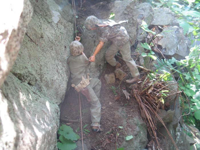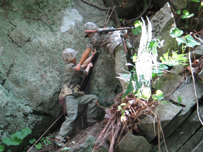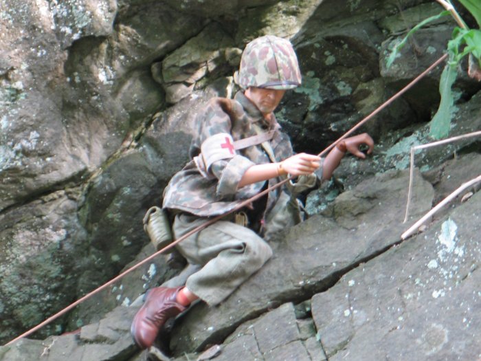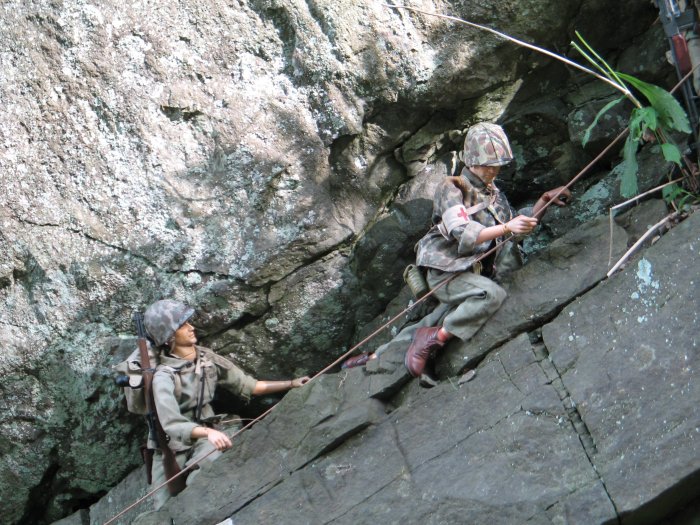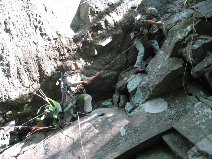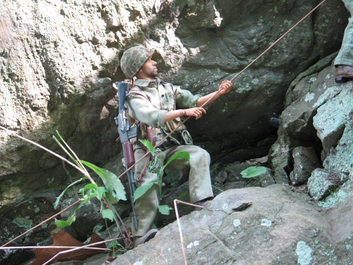| In this scene, the Marines are climbing up a steep cliff. Their orders are to make it to the top of this boulder and set up shop on the top of the huge hill, and wait for further orders. . . |
