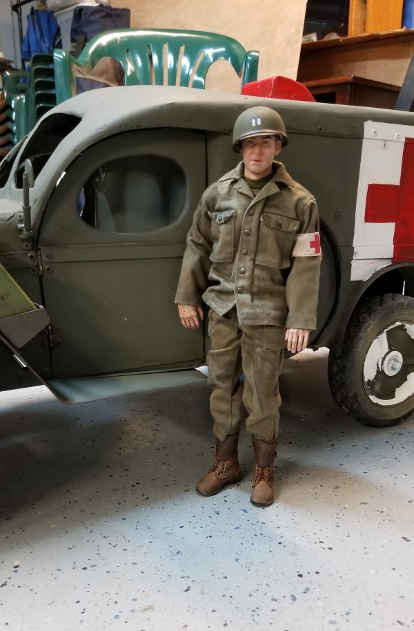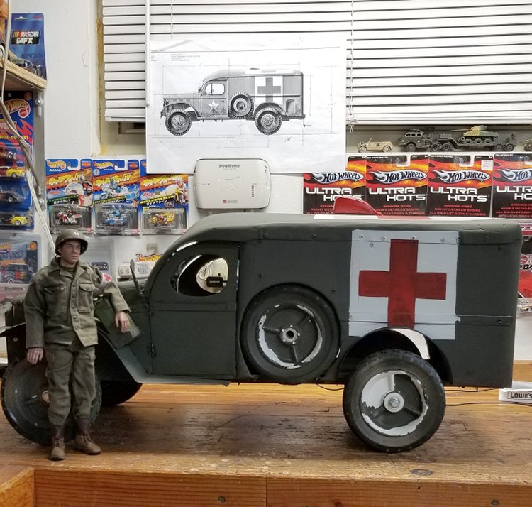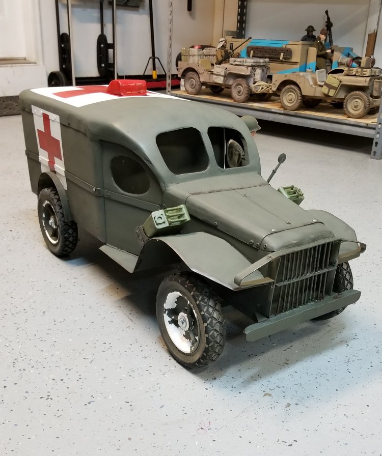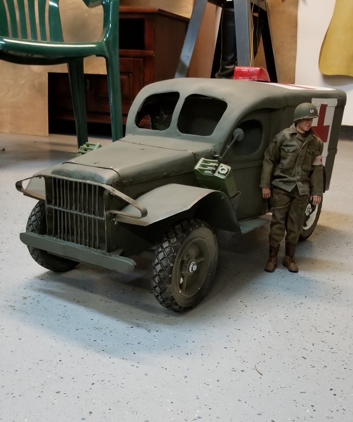 | About 85% completed on a WC54 ambulance. Been working on it for the last 3 weeks on and off. Biggest issue is coming up with the pieces to complete the wheel covers, some ideas but nothing yet. Will be doing some outdoor scenes real soon hopefully my next posting. Hope you troops enjoy. |