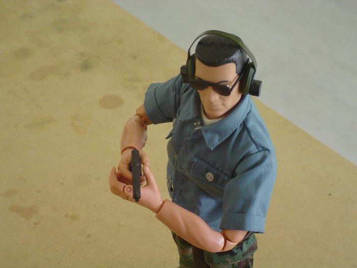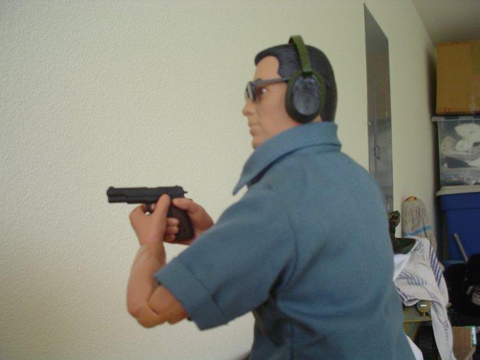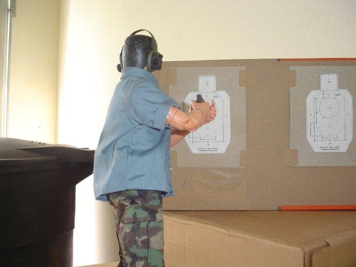 | "Here, Sanchez takes careful aim even though he stands only feet away of his target. Note, when on the range, we always use ear and eye protection" |